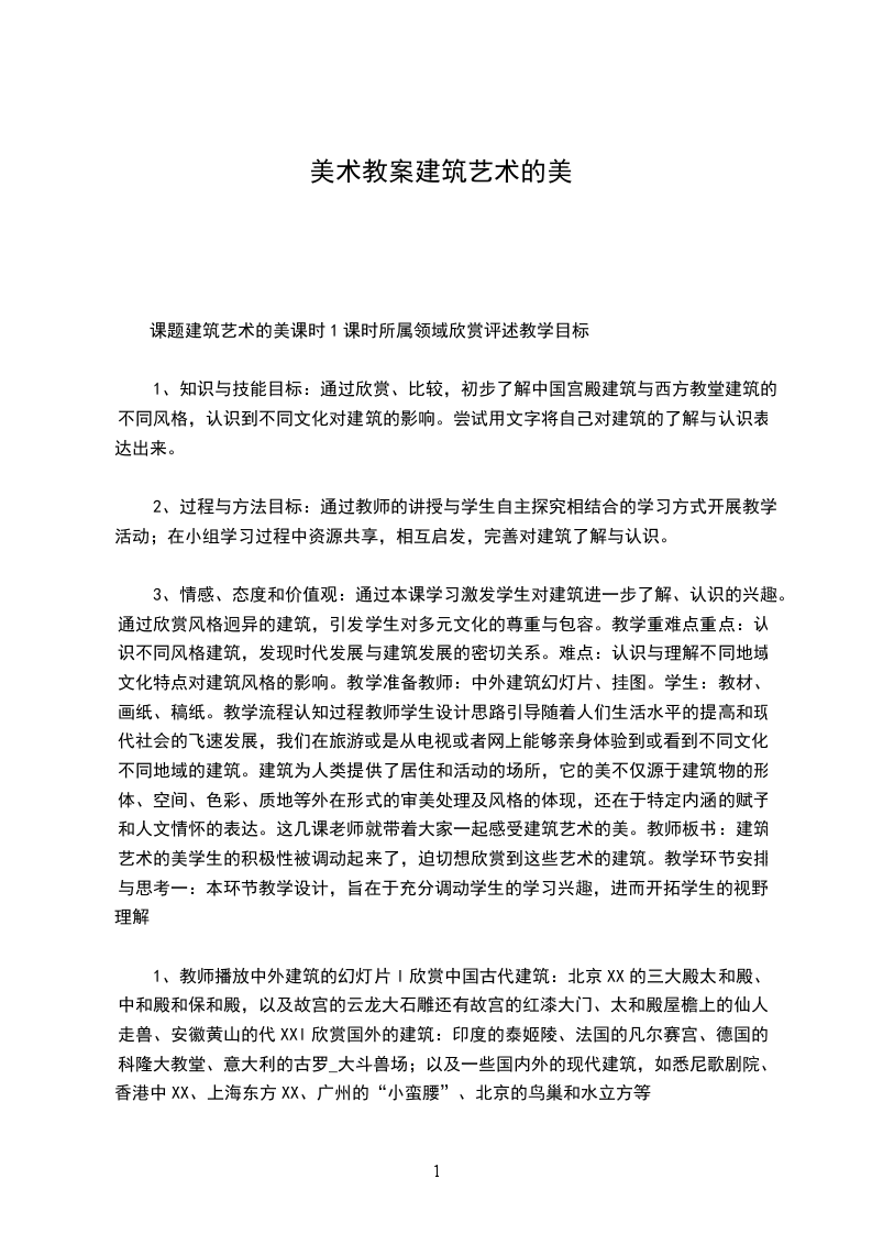 3、情感、态度和价值观:通过本课学习激发学生对建筑进一步了解、认识的兴趣。通过欣赏风格迥异的建筑,引发学生对多元文化的尊重与包容。教学重难点重点:认识不同风格建筑,发现时代发展与建筑发展的密切关系。难点:认识与理解不同地域文化特点对建筑风格的影响。教学准备教师:中外建筑幻灯片、挂图。学生:教材、画纸、稿纸。教学流程认知过程教师学生设计思路引导随着人们生活水平的提高和现代社会的飞速发展,我们在旅游或是从电视或者网上能够亲身体验到或看到不同文化、不同地域的建筑。建筑为人类提供了居住和活动的场所,它的美不仅源于建筑物的形体、空间、色彩、质地等外在形式的审美处理及风格的体现,还在于特定内涵的赋予和人文情怀的表达。这几课老师就带着大家一起感受建筑艺术的美。教师板书:建筑艺术的美学生的积极性被调动起来了,迫切想欣赏到这些艺术的建筑。教学环节安排与思考一:本环节教学设计,旨在于充分调动学生的学习兴趣,进而开拓学生的视野。理解