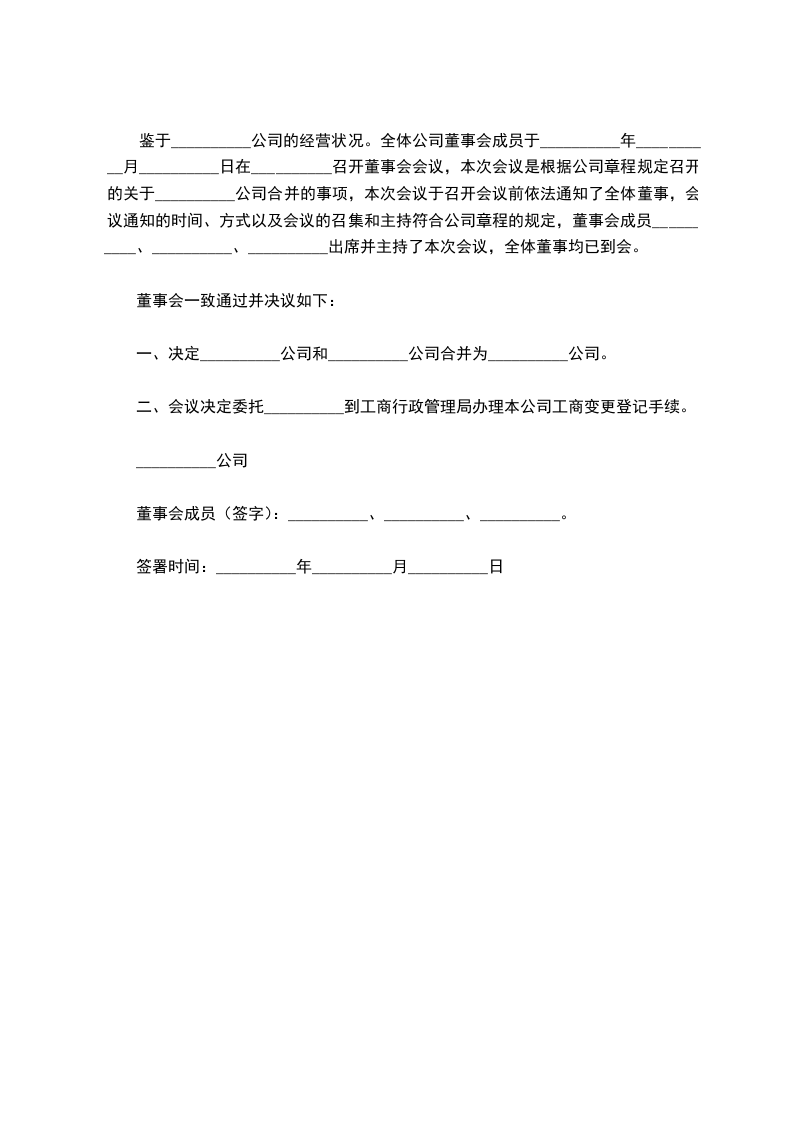 鉴于__________公司的经营状况。全体公司董事会成员于__________年__________月__________日在__________召开董事会会议,本次会议是根据公司章程规定召开的关于__________公司合并的事项,本次会议于召开会议前依法通知了全体董事,会议通知的时间、方式以及会议的召集和主持符合公司章程的规定,董事会成员__________、__________、__________出席并主持了本次会议,全体董事均已到会。