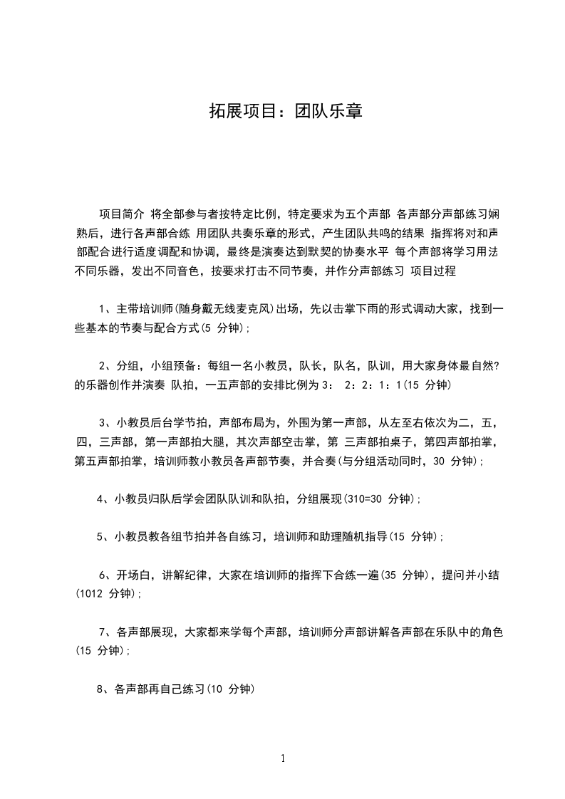 项目简介 将全部参与者按特定比例,特定要求为五个声部 各声部分声部练习娴熟后,进行各声部合练 用团队共奏乐章的形式,产生团队共鸣的结果 指挥将对和声部配合进行适度调配和协调,最终是演奏达到默契的协奏水平 每个声部将学习用法不同乐器,发出不同音色,按要求打击不同节奏,并作分声部练习 项目过程