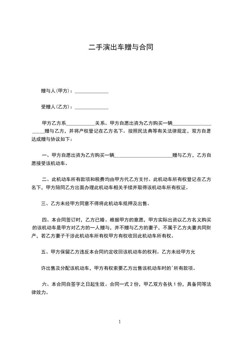 第一条甲方将其所有的______________牌汽车一辆(车牌号:____________________________)无偿赠送给乙方,乙方同意接受赠与。