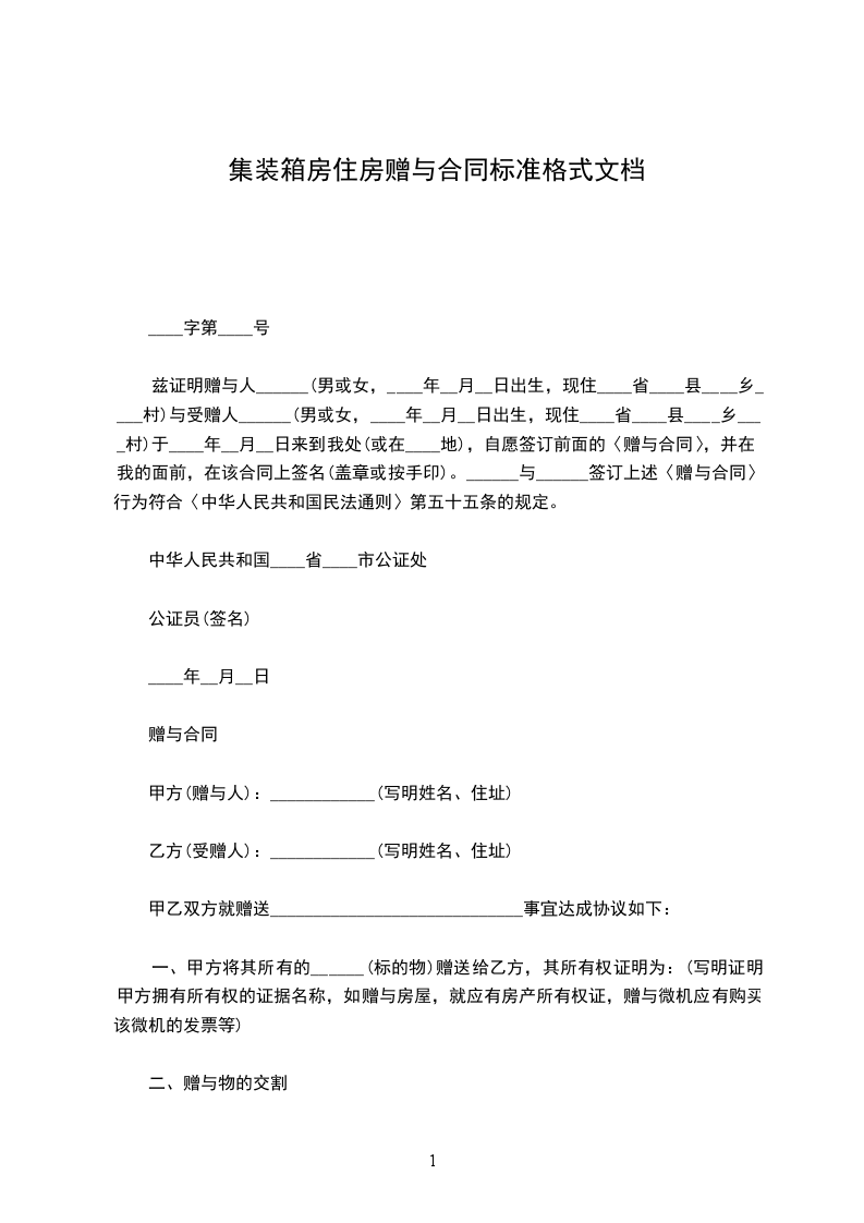 一、甲方将其所有的______(标的物)赠送给乙方,其所有权证明为:(写明证明甲方拥有所有权的证据名称,如赠与房屋,就应有房产所有权证,赠与微机应有购买该微机的发票等)