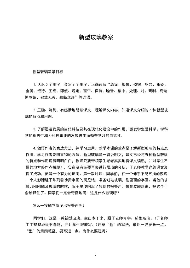 4.领悟作者的表达方法,并学习运用。教学本课的重点是了解新型玻璃的特点及作用,学习作者说明事物的方法。新型玻璃是一篇说明文,课文已经将五种新型玻璃的特点和作用说得明明白白,教师只要带领学生老老实实地将课文读熟,并对学生不懂的地方略作点拨即可,实在没有必要再去进行烦琐的分析。于老师教学这篇课文取得了成功,便是一个有力的证明。第一教时师:同学们,在一个伸手不见五指的夜晚,一个人影蹿进了陈列着珍贵字画的展览馆,准备划破玻璃,偷里面的字画。当他的玻璃刀刚刚触及玻璃的时候,院子里便响起了急促的报警声。警察立即赶来,把这个小俞给抓住了。同学们一定会奇怪地问:这是什么玻璃呀?
