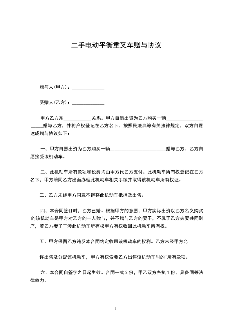 第一条甲方将其所有的__________牌汽车一辆(车牌号:_______________)无偿赠送给乙方,乙方同意接受赠与。