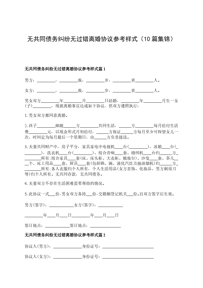 无共同债务纠纷无过错离婚协议参考样式篇10