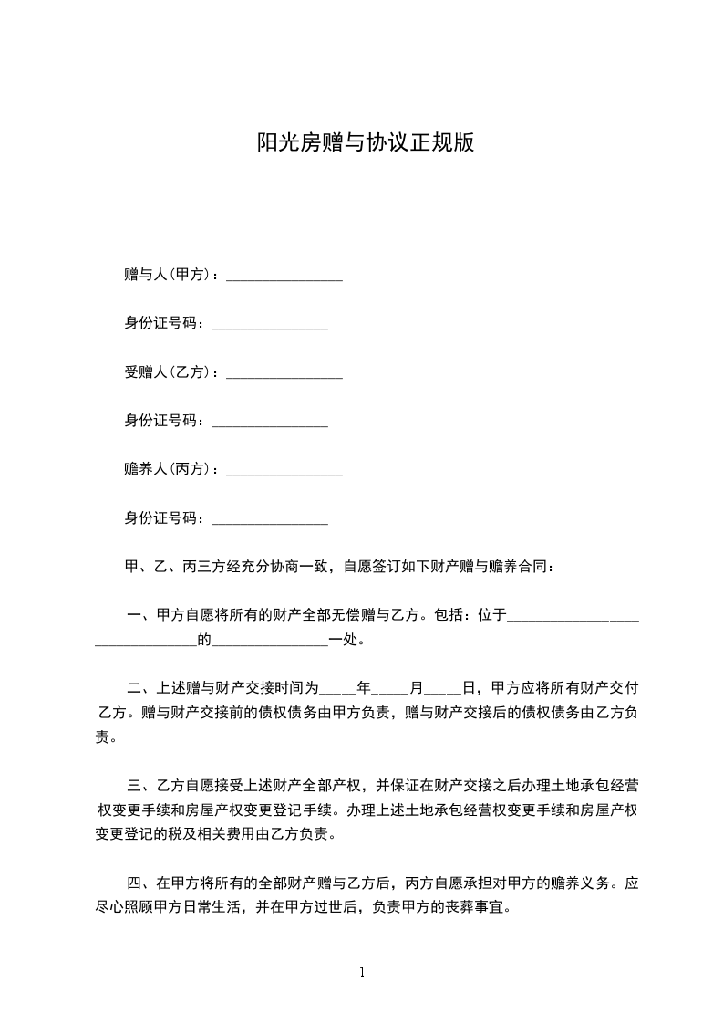 甲、乙、丙三方经充分协商一致,自愿签订如下财产赠与赡养合同: