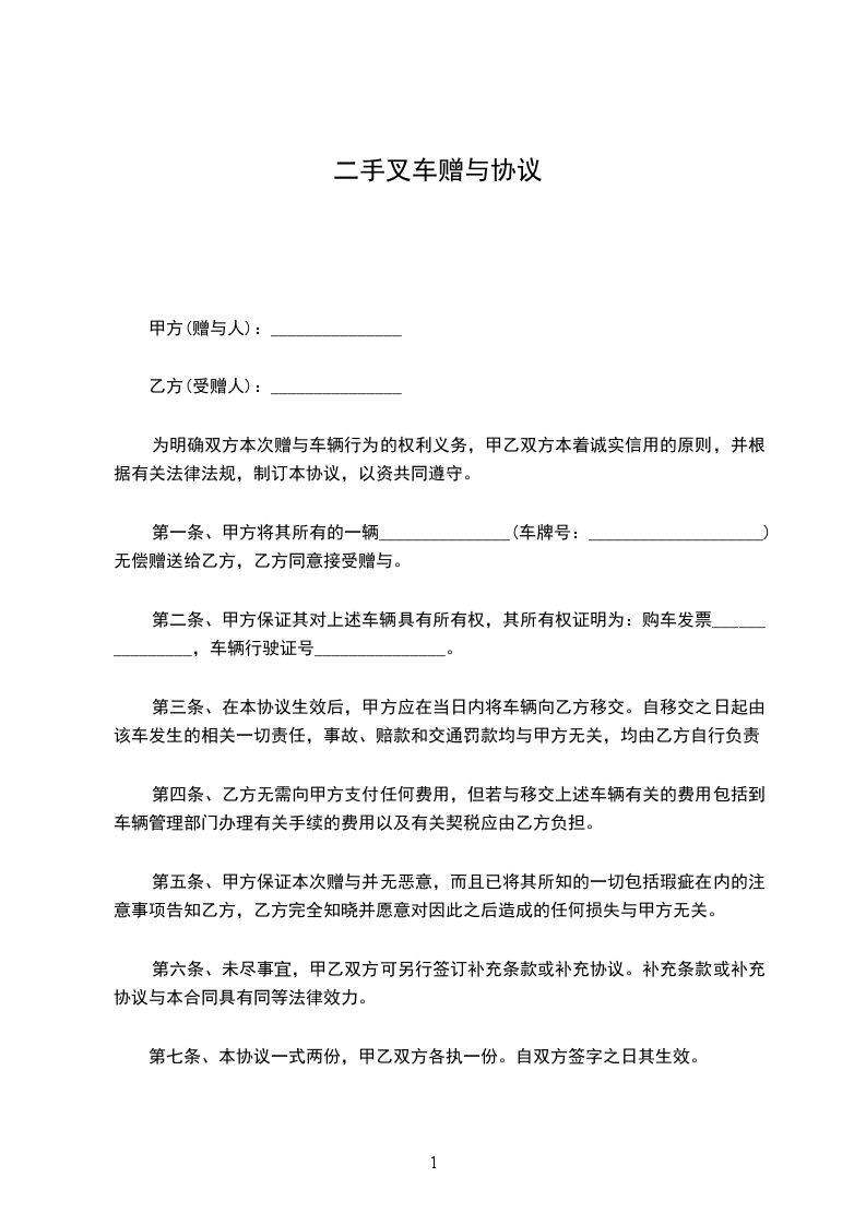 第一条、甲方将其所有的一辆_______________(车牌号:____________________)无偿赠送给乙方,乙方同意接受赠与。