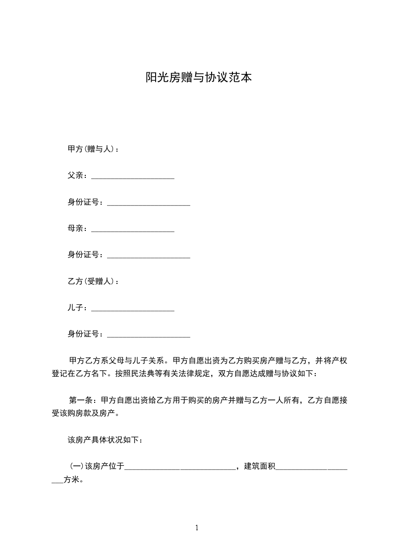 甲方乙方系父母与儿子关系。甲方自愿出资为乙方购买房产赠与乙方,并将产权登记在乙方名下。按照民法典等有关法律规定,双方自愿达成赠与协议如下: