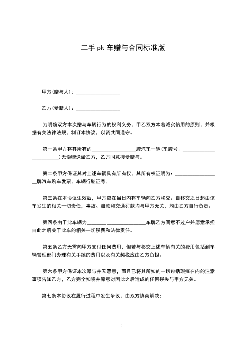 第一条甲方将其所有的__________________牌汽车一辆(车牌号:________________________)无偿赠送给乙方,乙方同意接受赠与。