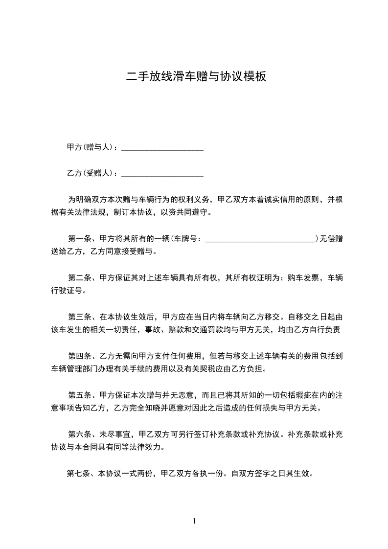第一条甲方将其所有的__________________牌汽车一辆(车牌号:________________________)无偿赠送给乙方,乙方同意接受赠与。