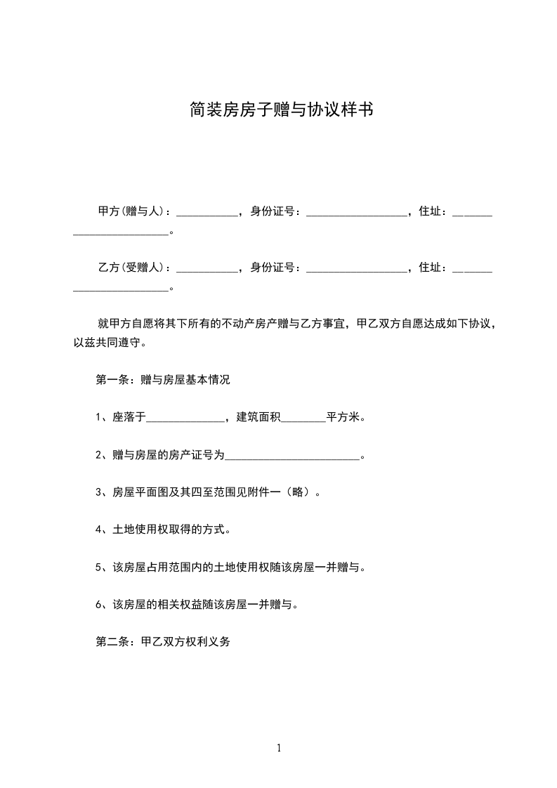 简装房房子赠与协议样本