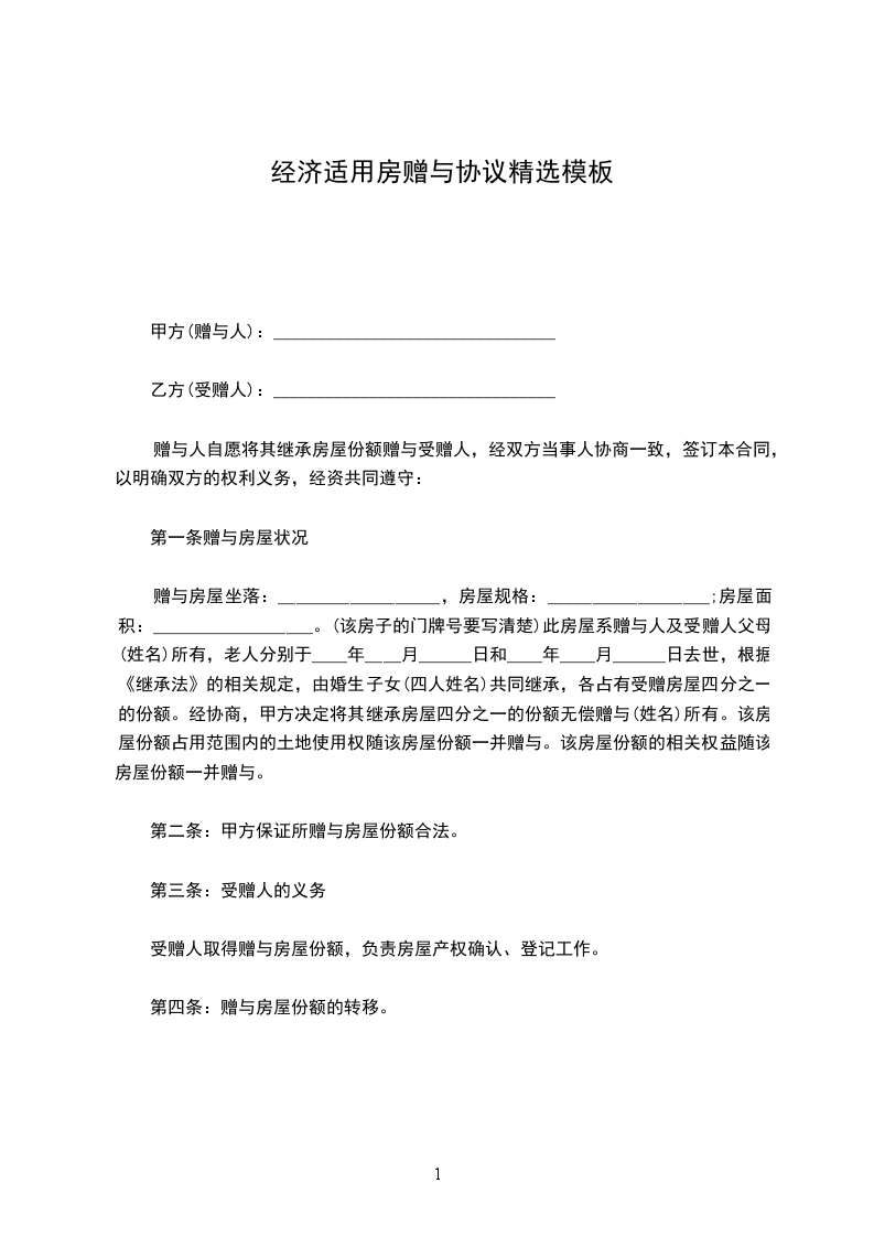 赠与房屋坐落:__________________,房屋规格:__________________;房屋面积:__________________。(该房子的门牌号要写清楚)此房屋系赠与人及受赠人父母(姓名)所有,老人分别于____年____月______日和____年____月______日去世,根据《继承法》的相关规定,由婚生子女(四人姓名)共同继承,各占有受赠房屋四分之一的份额。经协商,甲方决定将其继承房屋四分之一的份额无偿赠与(姓名)所有。该房屋份额占用范围内的土地使用权随该房屋份额一并赠与。该房屋份额的相关权益随该房屋份额一并赠与。