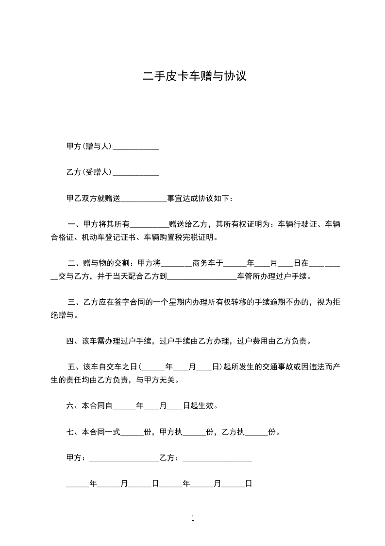一、甲方将其所有__________赠送给乙方,其所有权证明为:车辆行驶证、车辆合格证、机动车登记证书、车辆购置税完税证明。