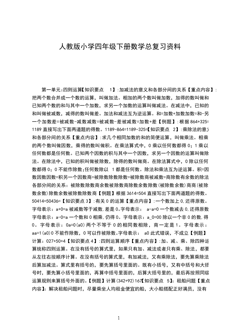 第一单元:四则运算【知识要点1】:加减法的意义和各部分间的关系【重点内容】:把两个数合并成一个数的运算,叫做加法。相加的两个数叫做加数,加得的数叫做和。已知两个数的和与其中一个加数,求另一个加数的运算叫做减法。在减法中,已知的和叫做被减数,减得的数叫做差。加法和减法互为逆运算。和=加数+加数加数=和-另一个加数差=被减数-减数减数=被减数-差被减数=加数+差【例题】:根据864+325=1189直接写出下面两道题的得数。1189-864=1189-325=【知识要点2】:乘除法的意义和各部分间的关系【重点内容】:求几个相同加数的和的简便运算,叫做乘法。相乘的两个数叫做因数,乘得的数叫做积。在乘法算式中,0乘以任何数都得0;1乘以任何数都是任何数。已知两个因数的积与其中一个因数,求另一个因数的运算叫做除法。在除法中,已知的积叫做被除数,除得的数叫做商。在除法算式中,0除以任何数都得0;0不能作除数;任何数除以1都是任何数。除法和乘法互为逆运算。积=因数因数因数=积另一个因数商=被除数除数除数=被除数商被减数=商除数有余数的除法各部分间的关系:被除数除数商余数被除数商除数余数除数(被除数余数)商商(被除数余数)除数余数被除数除数商【例题】根据3614=504直接写出下面两道题的得数。50414=50436=【知识要点3】:有关0的运算【重点内容】:一个数加上0,还得原数。字母表示:a+0=a被减数等于减数,差是0。字母表示:a-a=0一个数减去0,还得原数。字母表示:a-0=a一个数和0相乘,仍得0。字母表示:a_0=00除以一个非0的数,得0。字母表示:0a=0(a0)两个不等于0的相同数相除,商一定是1。字母表示:aa=1(a0)0不能作除数,0可以作被除数。字母表示:a0此式错误,不成立【例题】:计算:027+50+4【知识要点4】:四则运算顺序【重点内容】:加、减、乘、除四种运算统称四则运算。在没有括号的算式里,如果只有加、减法或者只有乘、除法,都要从左往右按顺序计算。在没有括号的算式里,有加减法,又有乘除法,要先算乘除法,后算加减法。算式里有括号的,要先算括号里面的。既有小括号,又有中括号和大括号时,要先算小括号里面的,再算中括号里面的,后算大括号里的,最后再按照同级运算规则来算括号外面的。【例题】计算(342+92)167【知识要点5】:租船问题【重点内容】:解决租船问题时,尽量乘坐人均租金便宜的船,大小船搭配正好满员,没有空余座位时最省钱。【例题】:老师和同学们一起去划船,一共有30人,大船每条限乘6人,租金35元。小船每条限乘4人,租金20元。怎样租船最省钱?