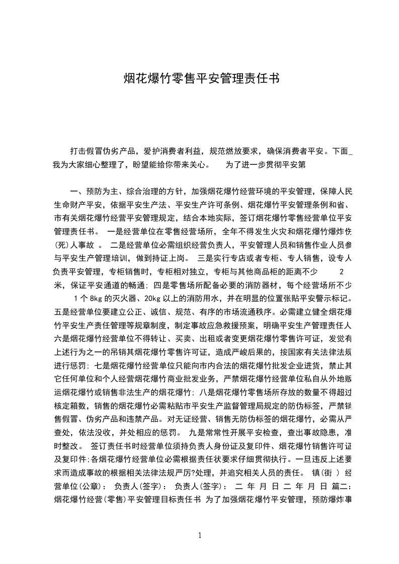 第六条 杜绝爆炸、火灾事故的发生,因管理不当和违规经营造成爆炸、火灾事故的依法追究相关责任人的责任。 本责任书一式两份(从2XXX年2月11日至2XXX年3月5日止),安监办存档一份,经营户留存一份。 王宝营子乡安监办 经营单位: 负责人: 负责人: XXXX年XX月XX日 篇三: 烟花爆竹零售经营责任书 为加强烟花爆竹平安管理、防止发生爆炸事故,保障公共平安和群众人身、财产平安,遵照平安第
