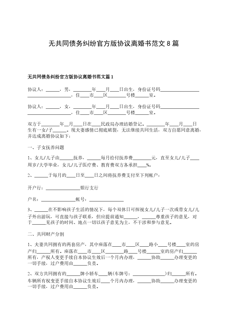 无共同债务纠纷官方版离婚协议参考样板篇8