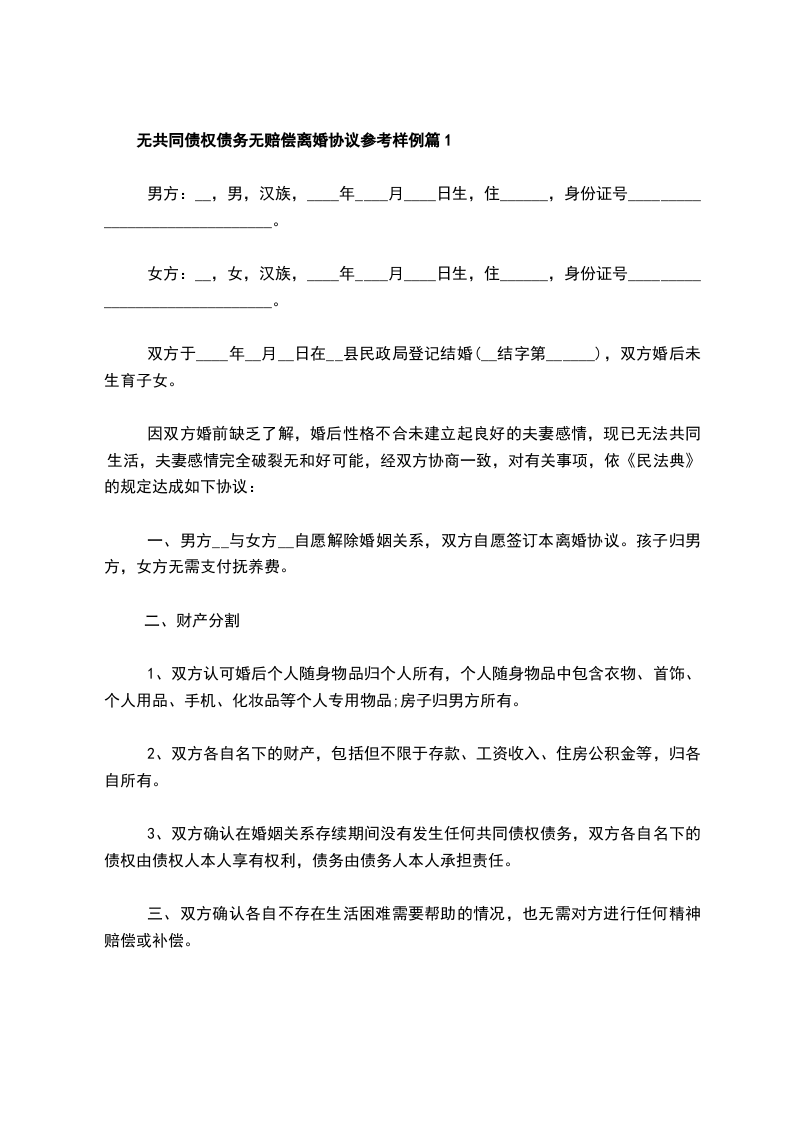 无共同债权债务无赔偿离婚协议参考样例篇1