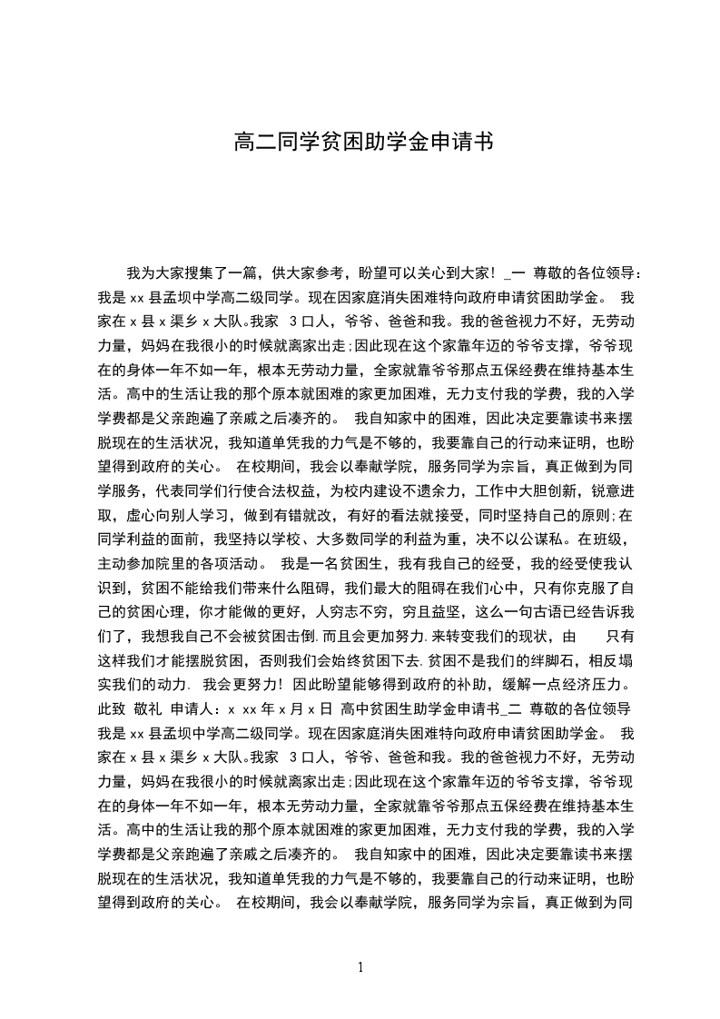 我为大家搜集了一篇,供大家参考,盼望可以关心到大家! _一 尊敬的各位领导: 我是xx县孟坝中学高二级同学。现在因家庭消失困难特向政府申请贫困助学金。 我家在x县x渠乡x大队。我家3口人,爷爷、爸爸和我。我的爸爸视力不好,无劳动力量,妈妈在我很小的时候就离家出走;因此现在这个家靠年迈的爷爷支撑,爷爷现在的身体一年不如一年,根本无劳动力量,全家就靠爷爷那点五保经费在维持基本生活。高中的生活让我的那个原本就困难的家更加困难,无力支付我的学费,我的入学学费都是父亲跑遍了亲戚之后凑齐的。 我自知家中的困难,因此决定要靠读书来摆脱现在的生活状况,我知道单凭我的力气是不够的,我要靠自己的行动来证明,也盼望得到政府的关心。 在校期间,我会以奉献学院,服务同学为宗旨,真正做到为同学服务,代表同学们行使合法权益,为校内建设不遗余力,工作中大胆创新,锐意进取,虚心向别人学习,做到有错就改,有好的看法就接受,同时坚持自己的原则;在同学利益的面前,我坚持以学校、大多数同学的利益为重,决不以公谋私。在班级,主动参加院里的各项活动。 我是一名贫困生,我有我自己的经受,我的经受使我认识到,贫困不能给我们带来什么阻碍,我们最大的阻碍在我们心中,只有你克服了自己的贫困心理,你才能做的更好,人穷志不穷,穷且益坚,这么一句古语已经告诉我们了,我想我自己不会被贫困击倒.而且会更加努力.来转变我们的现状,由 只有这样我们才能摆脱贫困,否则我们会始终贫困下去.贫困不是我们的绊脚石,相反塌实我们的动力. 我会更努力! 因此盼望能够得到政府的补助,缓解一点经济压力。 此致 敬礼 申请人:x xx年x月x日 高中贫困生助学金申请书_二 尊敬的各位领导: 我是xx县孟坝中学高二级同学。现在因家庭消失困难特向政府申请贫困助学金。 我家在x县x渠乡x大队。我家3口人,爷爷、爸爸和我。我的爸爸视力不好,无劳动力量,妈妈在我很小的时候就离家出走;因此现在这个家靠年迈的爷爷支撑,爷爷现在的身体一年不如一年,根本无劳动力量,全家就靠爷爷那点五保经费在维持基本生活。高中的生活让我的那个原本就困难的家更加困难,无力支付我的学费,我的入学学费都是父亲跑遍了亲戚之后凑齐的。 我自知家中的困难,因此决定要靠读书来摆脱现在的生活状况,我知道单凭我的力气是不够的,我要靠自己的行动来证明,也盼望得到政府的关心。 在校期间,我会以奉献学院,服务同学为宗旨,真正做到为同学服务,代表同学们行使合法权益,为校内建设不遗余力,工作中大胆创新,锐意进取,虚心向别人学习,做到有错就改,有好的看法就接受,同时坚持自己的原则;在同学利益的面前,我坚持以学校、大多数同学的利益为重,决不以公谋私。在班级,主动参加院里的各项活动。 我是一名贫困生,我有我自己的经受,我的经受使我认识到,贫困不能给我们带来什么阻碍,我们最大的阻碍在我们心中,只有你克服了自己的贫困心理,你才能做的更好,人穷志不穷, 穷且益坚,这么一句古语已经告诉我们了,我想我自己不会被贫困击倒。而且会更加努力。来转变我们的现状,由 只有这样我们才能摆脱贫困,否则我们会始终贫困下去。贫困不是我们的绊脚石,相反塌实我们的动力。 我会更努力! 因此盼望能够得到政府的补助,缓解一点经济压力。 高中生助学金申请书_三 尊敬的校领导: 我叫xx,来自高一