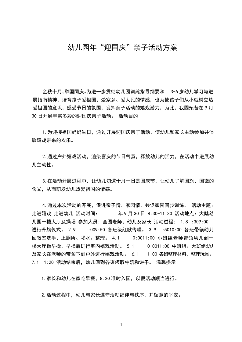 4.通过本次活动的开展,促进亲子情、家园情,共促家园同步训练。 活动主题:走进嬉戏 走进幼儿 活动时间: 年9月30日 8:30-11:30 活动地点:大陆幼儿园一楼大厅及操场 参加人员:全园老师、幼儿及家长 活动过程: 1.8 :309:00 进行升旗仪式。 2.9 :009:50 各班级红歌传唱。 3.9 :5010:00 各班带领幼儿回教室洗手、上厕所、喝水、整理。 4.1 0:0011:00 小班组老师带领幼儿到一楼大厅做早操,早操后进行室内嬉戏活动。 5.1 0:0011:00 中班组、大班组幼儿及家长在老师的带领下到户外进行嬉戏活动。 6.1 1:00 各班整理材料,整理玩具。 7.1 1:20 活动结束后,幼儿回到各班领取牛奶和饼干。 温馨提示