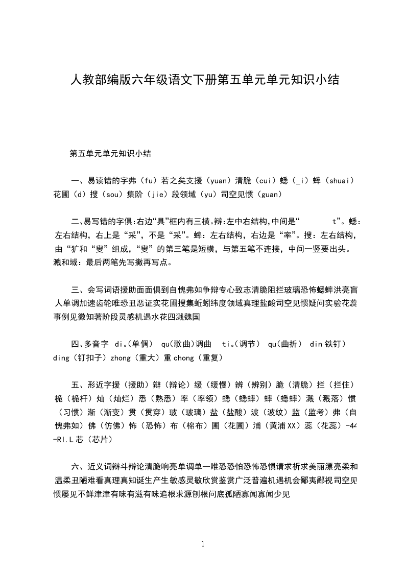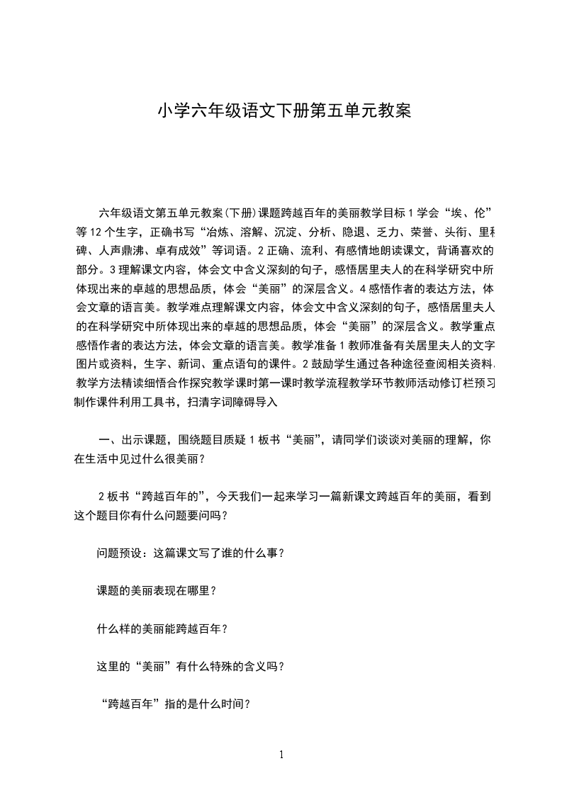 六年级语文第五单元教案(下册)课题跨越百年的美丽教学目标1学会“埃、伦”等12个生字,正确书写“冶炼、溶解、沉淀、分析、隐退、乏力、荣誉、头衔、里程碑、人声鼎沸、卓有成效”等词语。2正确、流利、有感情地朗读课文,背诵喜欢的部分。3理解课文内容,体会文中含义深刻的句子,感悟居里夫人的在科学研究中所体现出来的卓越的思想品质,体会“美丽”的深层含义。4感悟作者的表达方法,体会文章的语言美。教学难点理解课文内容,体会文中含义深刻的句子,感悟居里夫人的在科学研究中所体现出来的卓越的思想品质,体会“美丽”的深层含义。教学重点感悟作者的表达方法,体会文章的语言美。教学准备1教师准备有关居里夫人的文字图片或资料,生字、新词、重点语句的课件。2鼓励学生通过各种途径查阅相关资料。教学方法精读细悟合作探究教学课时第一课时教学流程教学环节教师活动修订栏预习制作课件利用工具书,扫清字词障碍导入