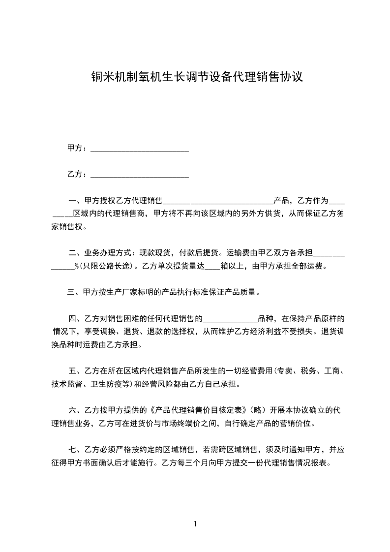 一、甲方授权乙方代理销售____________________________产品,乙方作为_________区域内的代理销售商,甲方将不再向该区域内的另外方供货,从而保证乙方独家销售权。