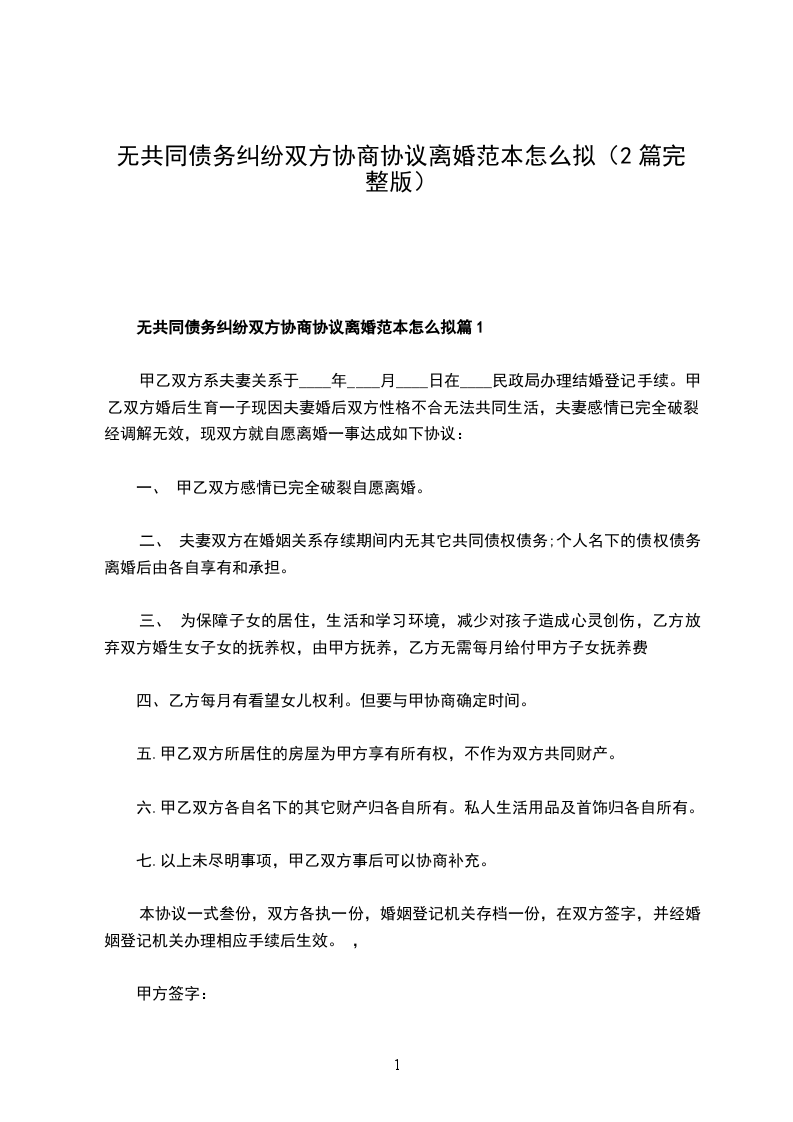 无共同债务纠纷双方协商离婚协议书样本篇1