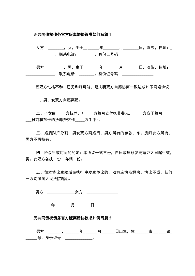 双方确认在婚姻关系存续期间没有发生任何共同债权和债务,如任何一方对外负有债权的,无论何时发现,另一方均有权平分;如对外负有债务的,则由负债方自行承担。