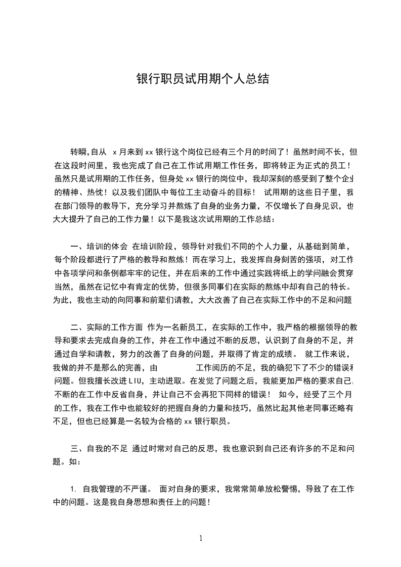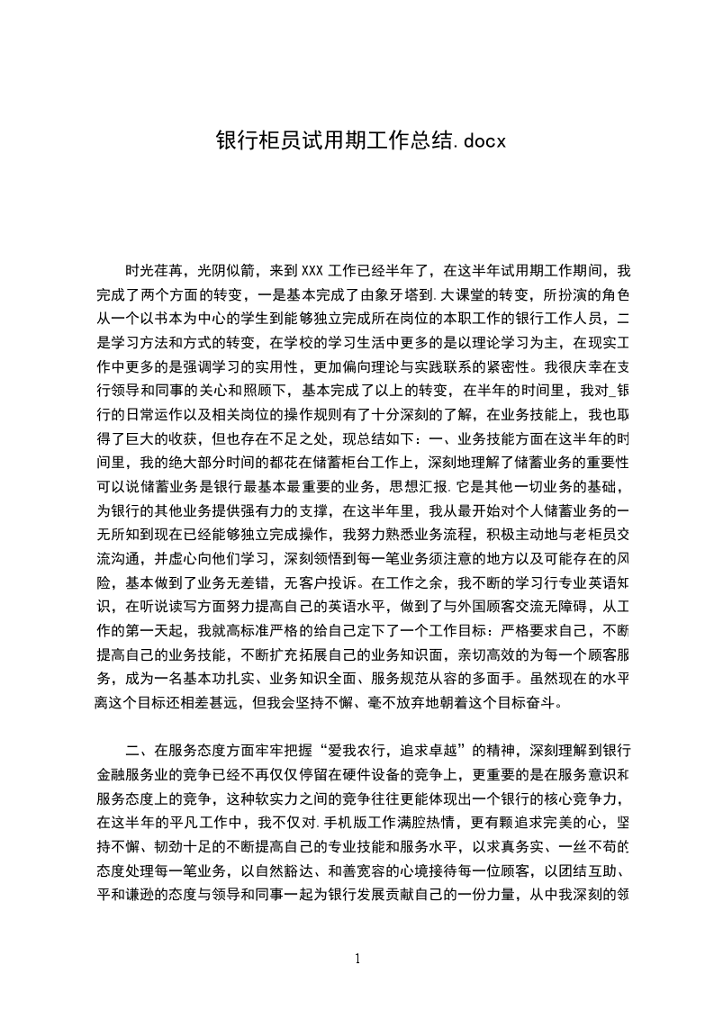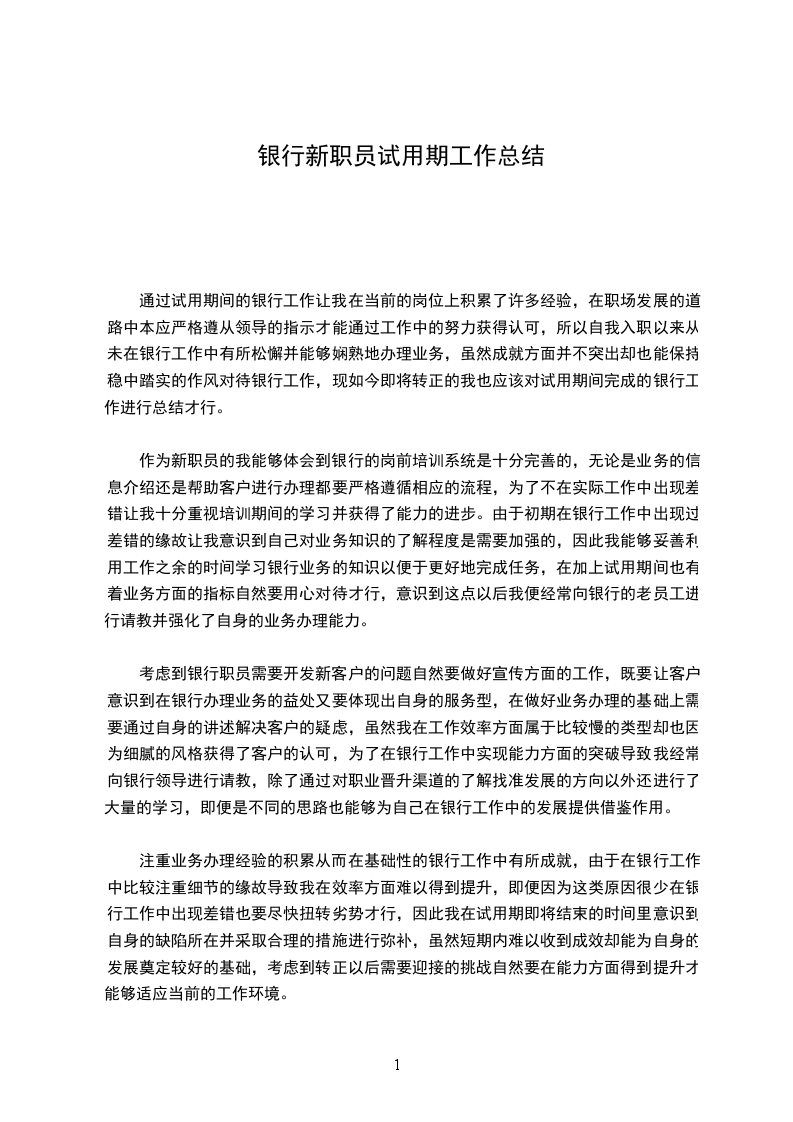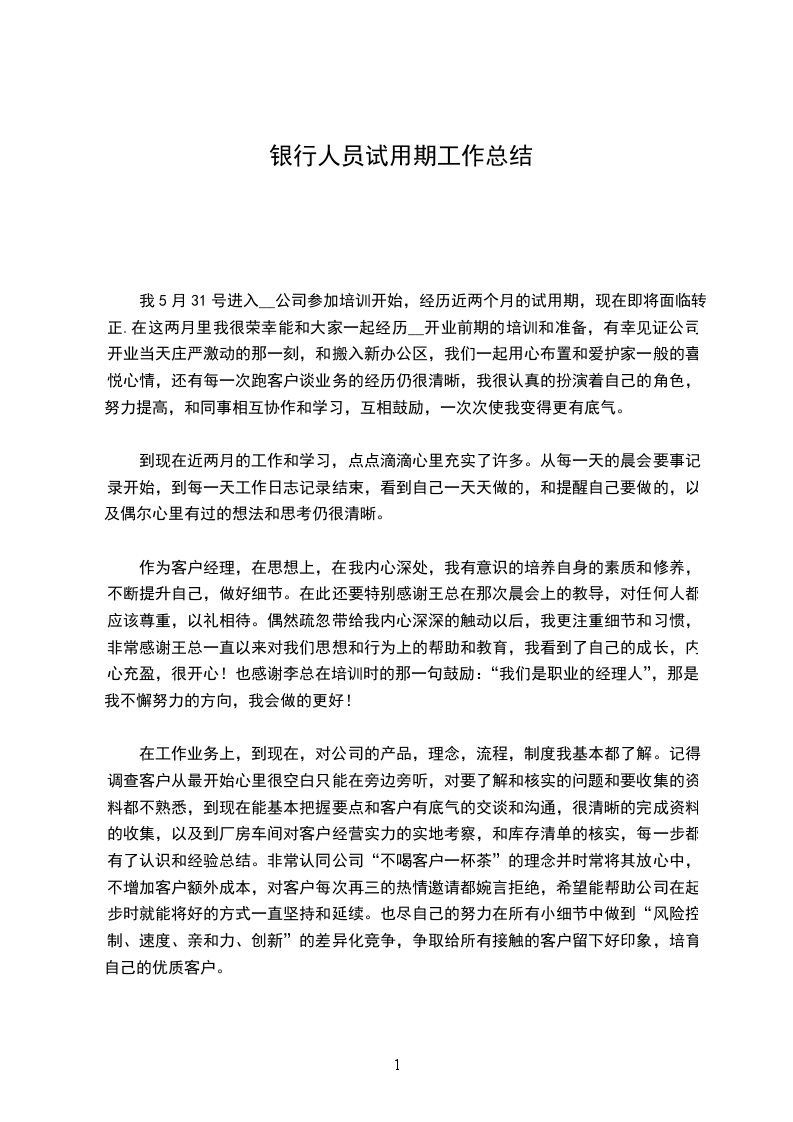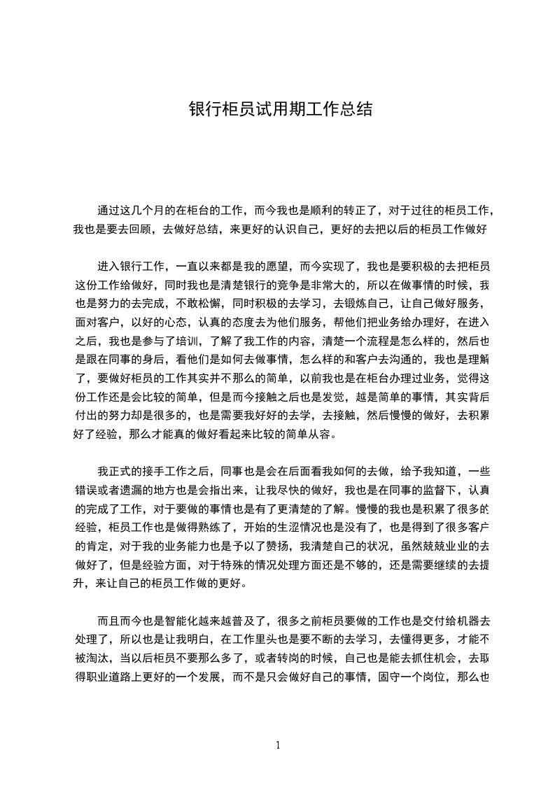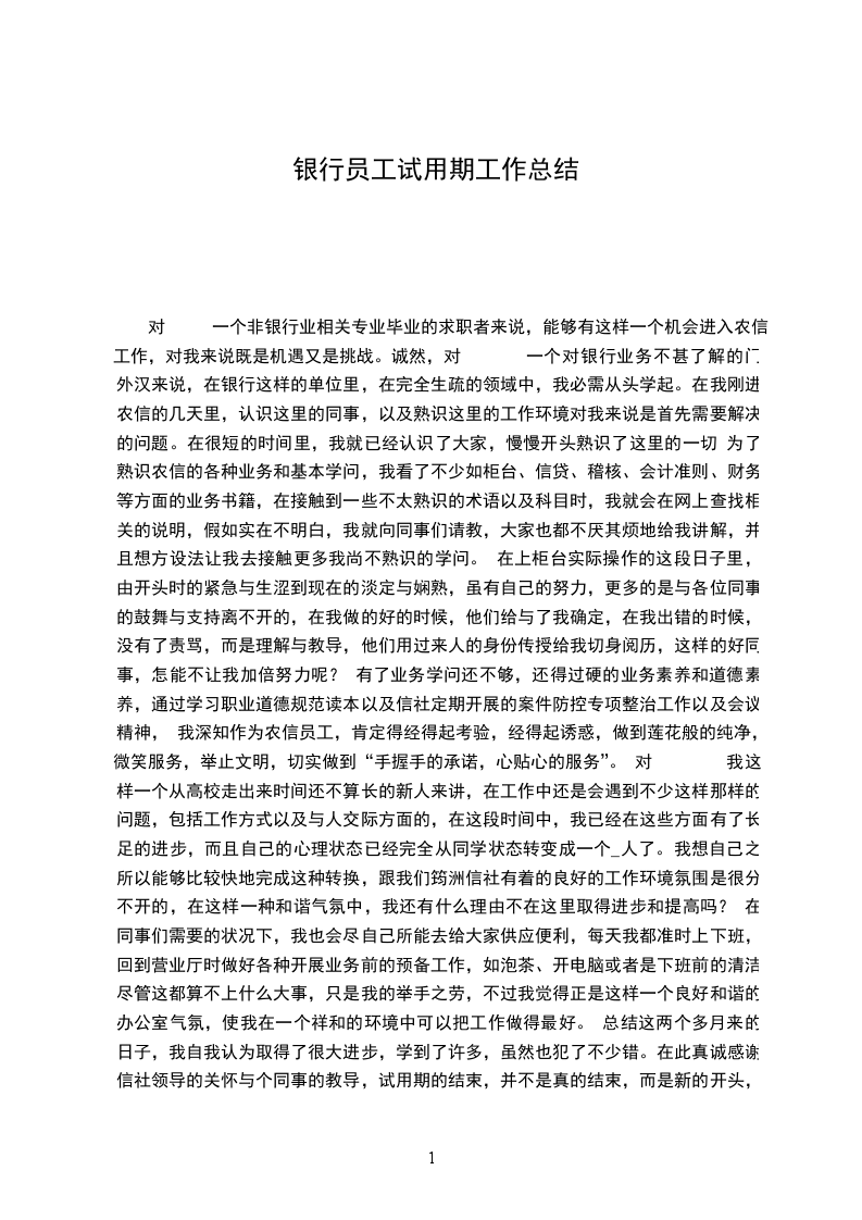 对 一个非银行业相关专业毕业的求职者来说,能够有这样一个机会进入农信工作,对我来说既是机遇又是挑战。诚然,对 一个对银行业务不甚了解的门外汉来说,在银行这样的单位里,在完全生疏的领域中,我必需从头学起。在我刚进农信的几天里,认识这里的同事,以及熟识这里的工作环境对我来说是首先需要解决的问题。在很短的时间里,我就已经认识了大家,慢慢开头熟识了这里的一切 为了熟识农信的各种业务和基本学问,我看了不少如柜台、信贷、稽核、会计准则、财务等方面的业务书籍,在接触到一些不太熟识的术语以及科目时,我就会在网上查找相关的说明,假如实在不明白,我就向同事们请教,大家也都不厌其烦地给我讲解,并且想方设法让我去接触更多我尚不熟识的学问。 在上柜台实际操作的这段日子里,由开头时的紧急与生涩到现在的淡定与娴熟,虽有自己的努力,更多的是与各位同事的鼓舞与支持离不开的,在我做的好的时候,他们给与了我确定,在我出错的时候,没有了责骂,而是理解与教导,他们用过来人的身份传授给我切身阅历,这样的好同事,怎能不让我加倍努力呢? 有了业务学问还不够,还得过硬的业务素养和道德素养,通过学习职业道德规范读本以及信社定期开展的案件防控专项整治工作以及会议精神, 我深知作为农信员工,肯定得经得起考验,经得起诱惑,做到莲花般的纯净,微笑服务,举止文明,切实做到“手握手的承诺,心贴心的服务”。 对 我这样一个从高校走出来时间还不算长的新人来讲,在工作中还是会遇到不少这样那样的问题,包括工作方式以及与人交际方面的,在这段时间中,我已经在这些方面有了长足的进步,而且自己的心理状态已经完全从同学状态转变成一个_人了。我想自己之所以能够比较快地完成这种转换,跟我们筠洲信社有着的良好的工作环境氛围是很分不开的,在这样一种和谐气氛中,我还有什么理由不在这里取得进步和提高吗? 在同事们需要的状况下,我也会尽自己所能去给大家供应便利,每天我都准时上下班,回到营业厅时做好各种开展业务前的预备工作,如泡茶、开电脑或者是下班前的清洁尽管这都算不上什么大事,只是我的举手之劳,不过我觉得正是这样一个良好和谐的办公室气氛,使我在一个祥和的环境中可以把工作做得最好。 总结这两个多月来的日子,我自我认为取得了很大进步,学到了许多,虽然也犯了不少错。在此真诚感谢信社领导的关怀与个同事的教导,试用期的结束,并不是真的结束,而是新的开头,是对我更严峻的考验,我将加倍努力,用青春的汗水去灌溉农信社这颗健壮成长的大树!