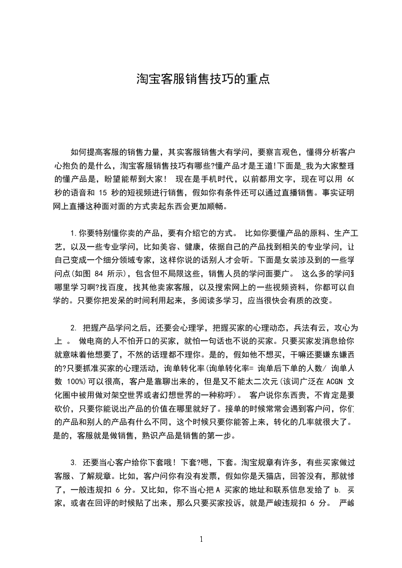 2. 把握产品学问之后,还要会心理学,把握买家的心理动态,兵法有云,攻心为上 。 做电商的人不怕开口的买家,就怕一句话也不说的买家。只要买家发消息给你,就意味着他想要了,不然的话理都不理你。是的,假如他不想买,干嘛还要嫌东嫌西的?只要抓准买家的心理活动,询单转化率(询单转化率= 询单后下单的人数/ 询单人数 100%)可以很高,客户是靠聊出来的,但是又不能太二次元(该词广泛在ACGN 文化圈中被用做对架空世界或者幻想世界的一种称呼)。 客户说你东西贵,不肯定是要砍价,只要你能说出产品的价值在哪里就好了。接单的时候常常会遇到客户问,你们的产品和别人的产品有什么不同,这个时候只要你能答上来,转化的几率就很大了。是的,客服就是做销售,熟识产品是销售的第一步。