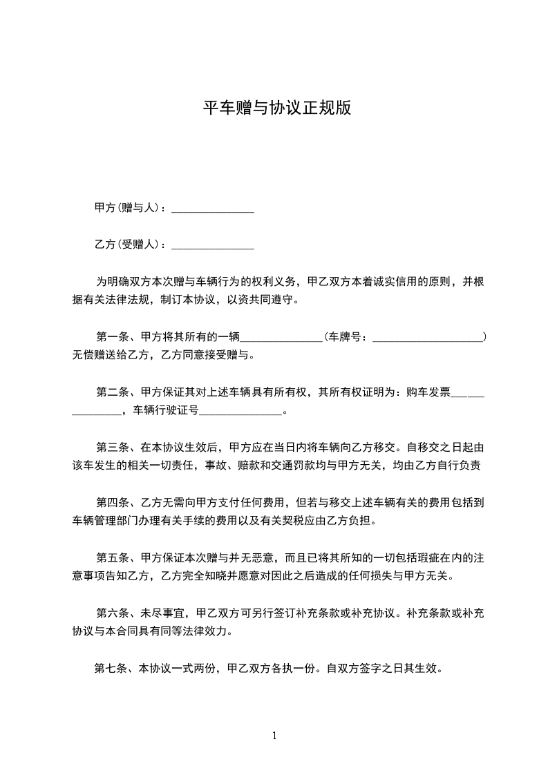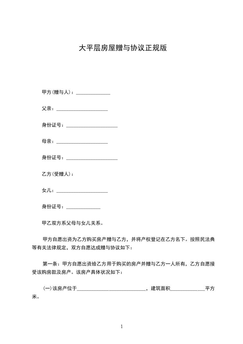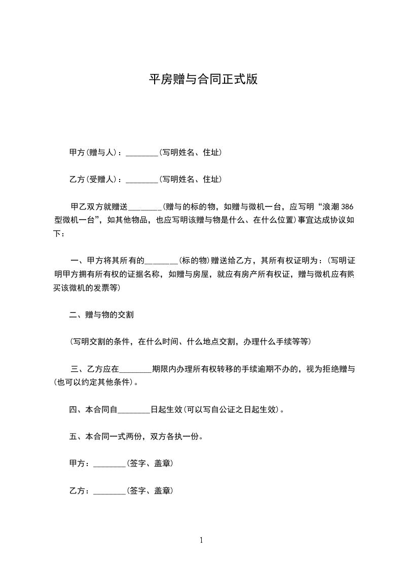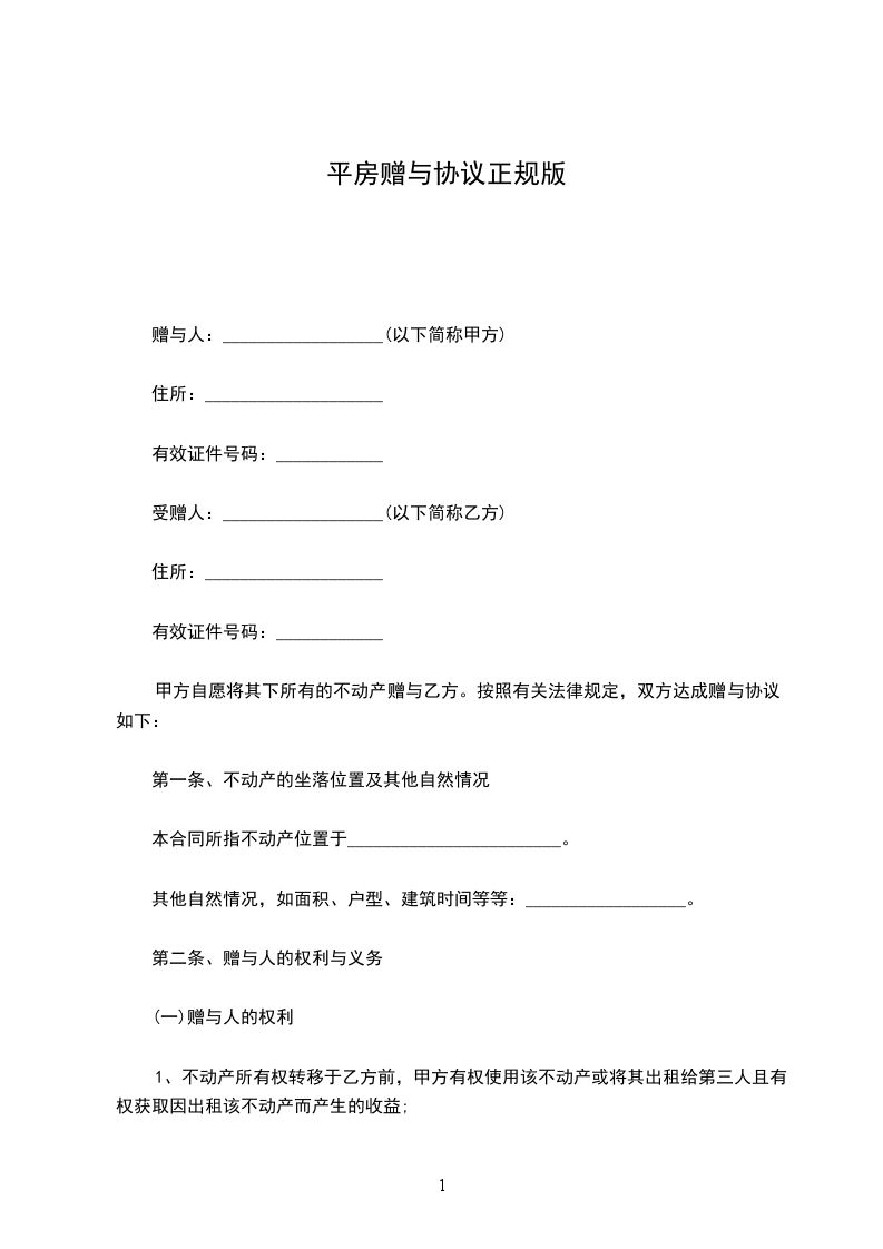 平房房子赠与协议正规版