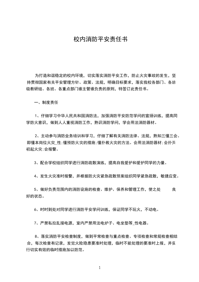 为打造和谐稳定的校内环境,切实落实消防平安工作,防止火灾事故的发生,坚持贯彻国家有关平安管理方针、政策、法规,明确目标要求,落实我校各部门、各班级教研组、各班、各重点部门谁主管谁负责的原则,特签订此责任书。