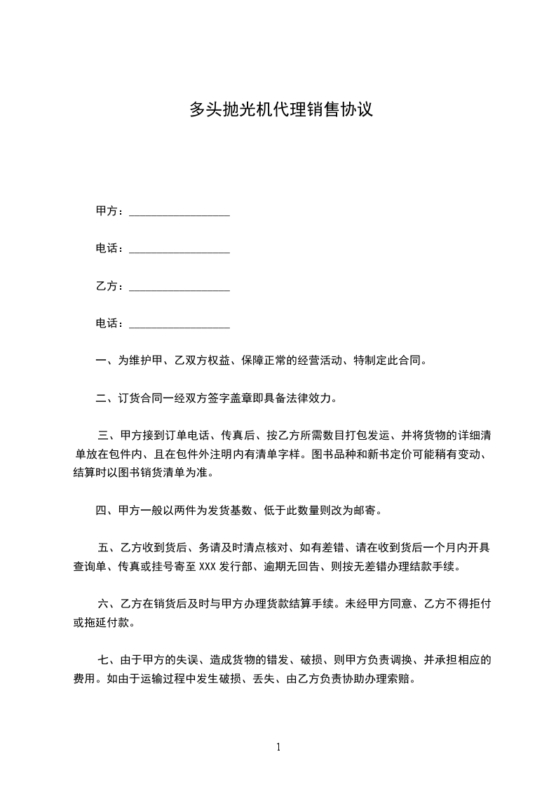 多头抛光机代理销售协议