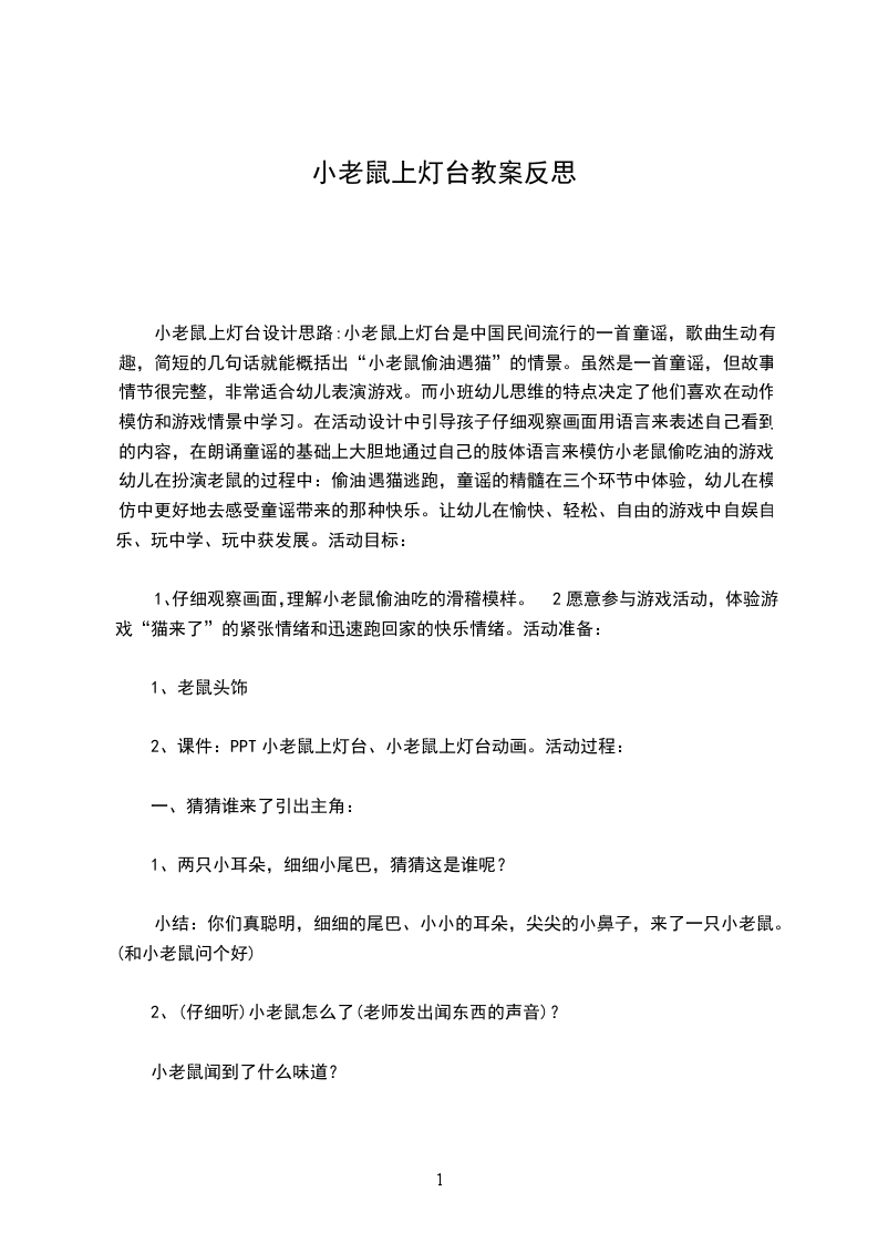 小结:今天虽然有猫咪来抓我们,但是能吃到香油感觉还是很开心的,下次妈妈再带大家一起去吃香油好不好。活动反思:小老鼠上灯台是一首比较老的童谣,但是童谣诙谐幽默,深得孩子们的喜爱。今天我在教学的时候,也有个别孩子已经会唱了这首歌曲。活动时,我先出示PPT小老鼠,吸引孩子的兴趣,接着老师根据童谣内容提问,“小老鼠在做什么?
