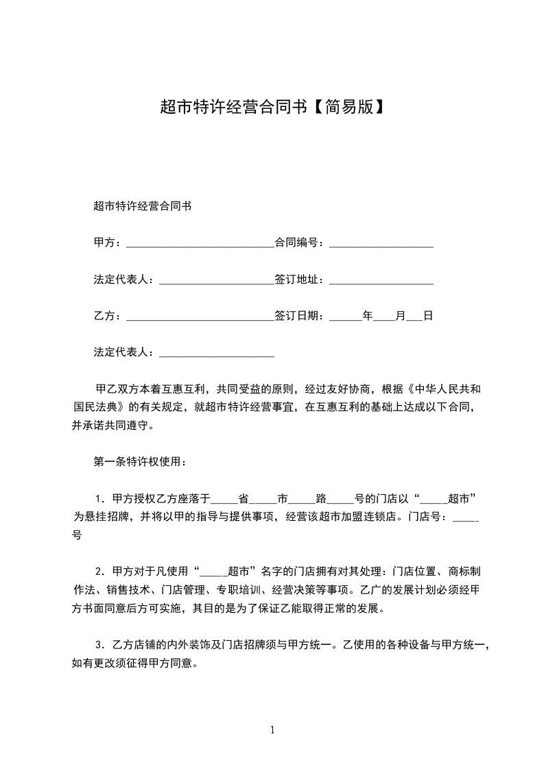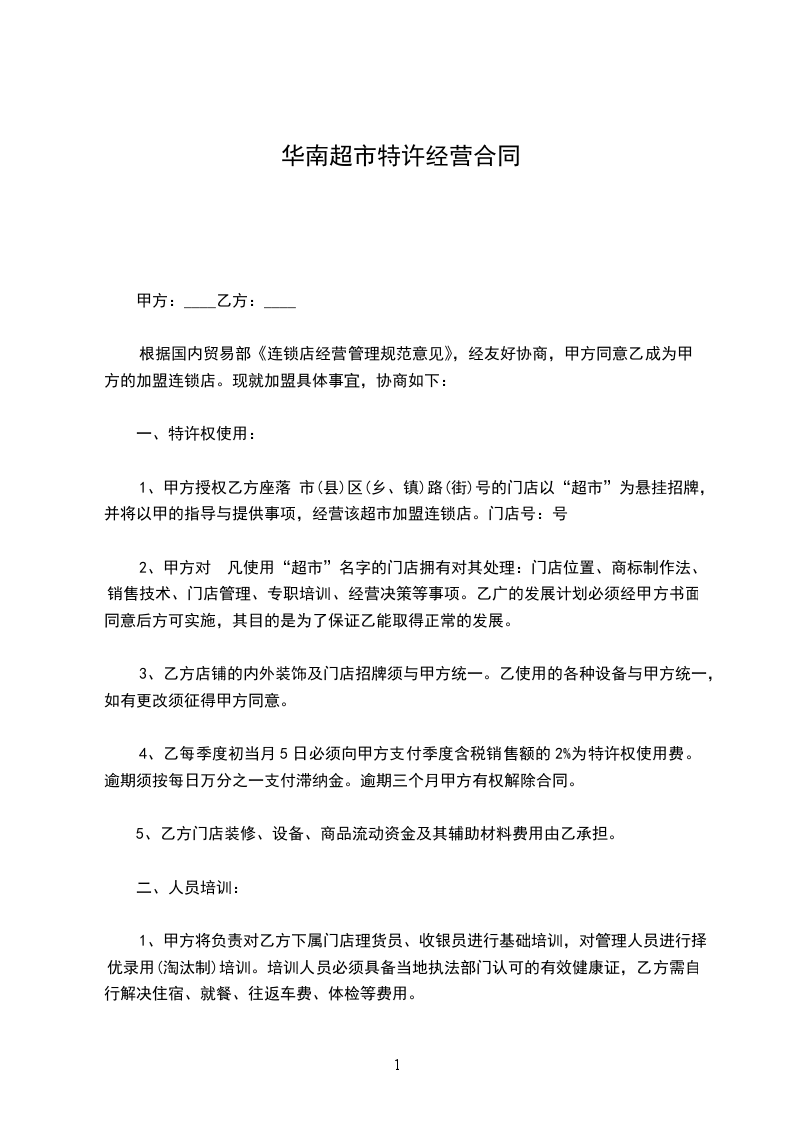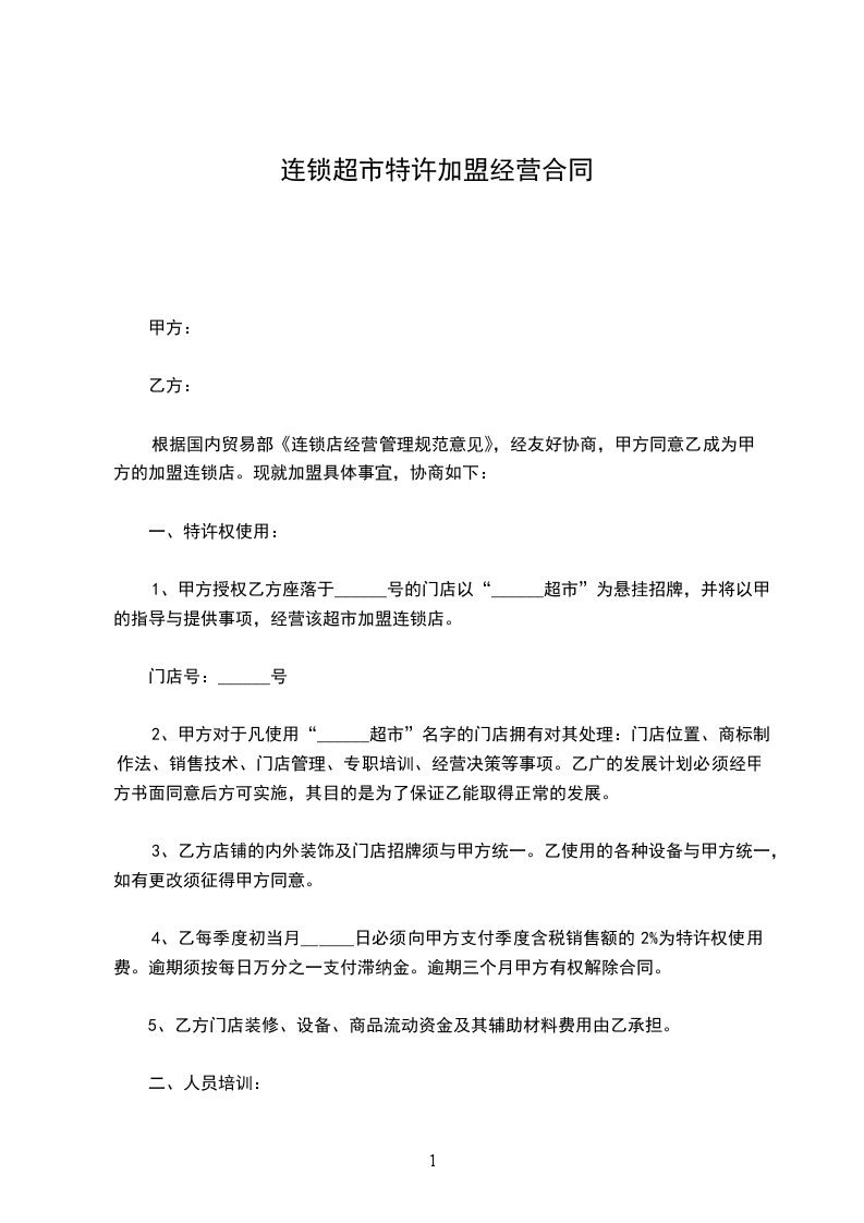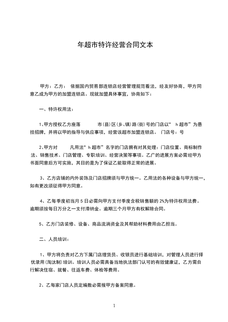 1、甲方授权乙方座落 市(县)区(乡、镇)路(街)号的门店以“h超市”为悬挂招牌,并将以甲的指导与供应事项,经营该超市加盟连锁店。 门店号:号