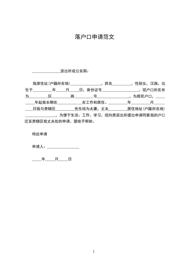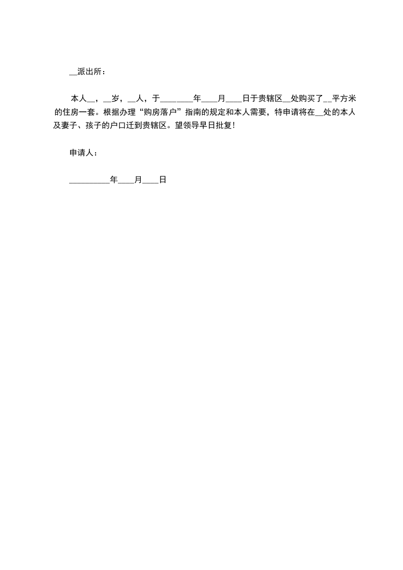 本人_______________,__________岁,户籍为贵辖区__________路__________号(与前妻_______________户籍一致)。_____________年_____月__________日,本人因与前妻_______________感情不合而在_______________民政局办理了离婚登记(或经__________人民法院判决离婚)。按离婚协议的约定(或按法院判决书的判决),__________路__________号的房屋归前妻_______________所有,为此,本人须搬离该处。现本人在__________区__________路__________号_____________小区购买了一套住房,并于_____________年_____月__________日实际入住。根据__________市户籍管理相关规定和本人需要,特申请将在贵辖区__________路__________号的本人户口迁移到__________区__________路__________号_____________小区__________号。