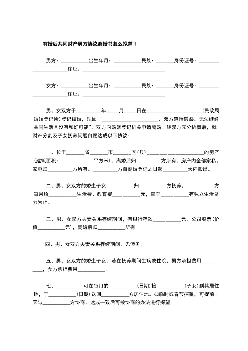 有婚后共同财产男方协议离婚书怎么拟篇2