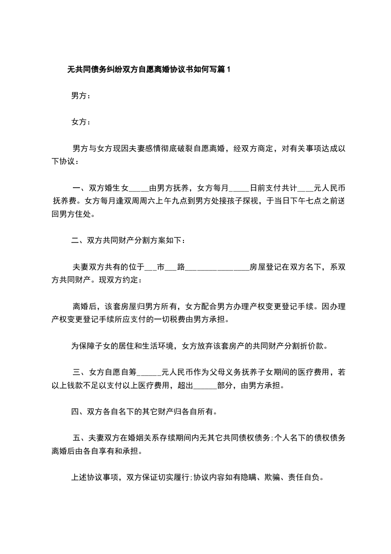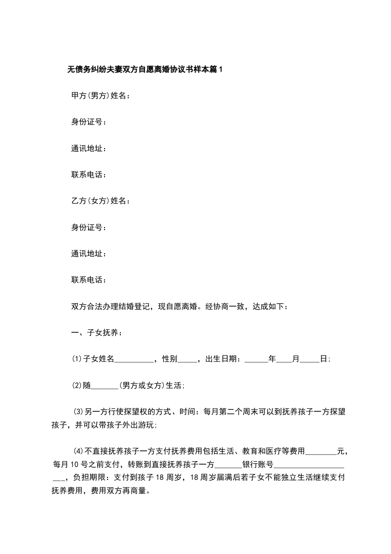 无债务纠纷双方自愿离婚协议书参考格式篇1