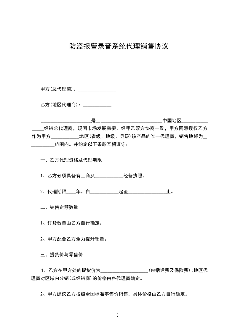 _____________________是____________________________中国地区________________经销总代理商,现因市场发展需要,经甲乙双方协商一致,甲方同意授权乙方作为甲方____________地区(省级、地级、县级)该产品的唯一代理商,销售地域为____________范围内。并约定以下条款互相遵守: