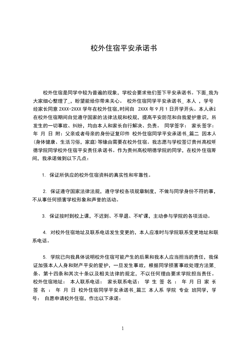 5. 学院已向我具体说明校外住宿可能产生的后果和我本人应当担当的责任,我保证加强本人人身和财产平安的爱护,一旦发生事故,根据同学损害事故处理方法第_条、第十四条和其次十条以及相关法律的规定,不以任何理由要求学院担当责任。 校外住宿地址: 本人联系电话: 家长联系电话: 学 生 签 名 : 年 月 日 家 长 签 名 : 年 月 日 校外住宿同学平安承诺书_篇三 本人系 学院 专业 班同学,学号: 自愿申请校外住宿,作出以下承诺: