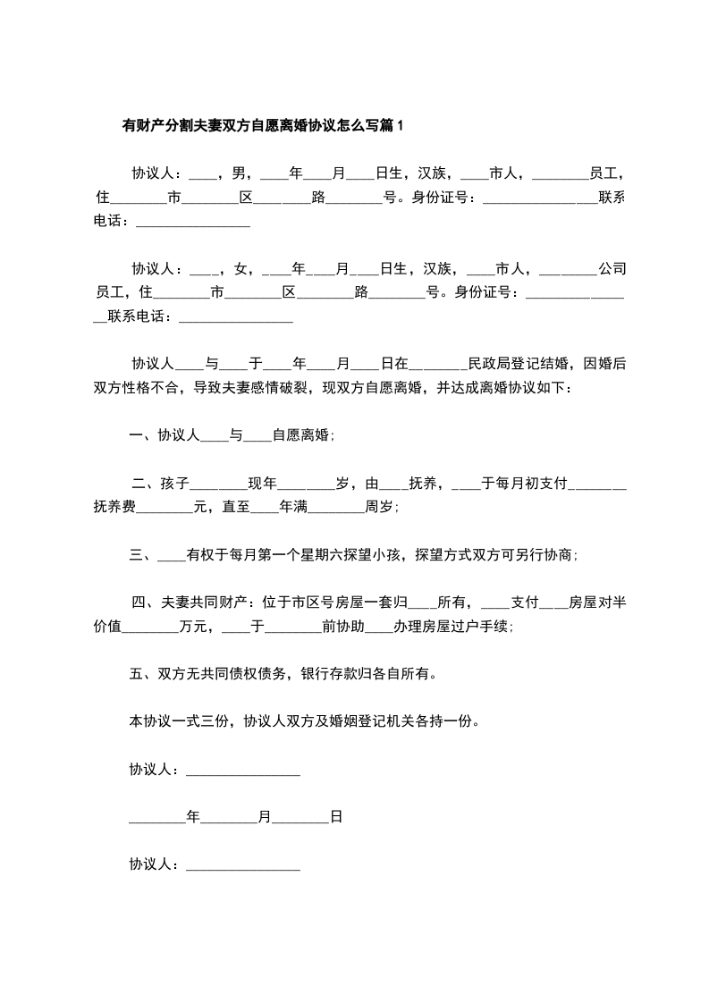 有财产分割夫妻双方自愿离婚协议怎么写篇1