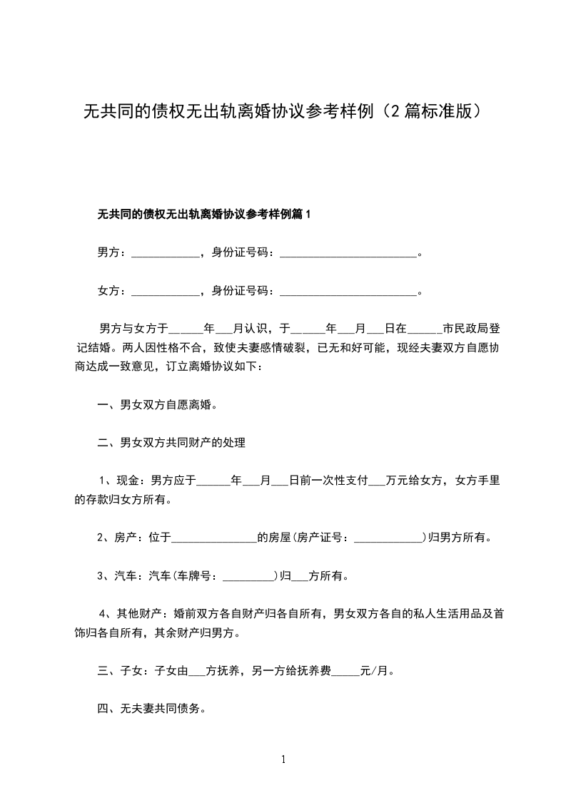 无共同的债权无出轨离婚协议参考样例篇1