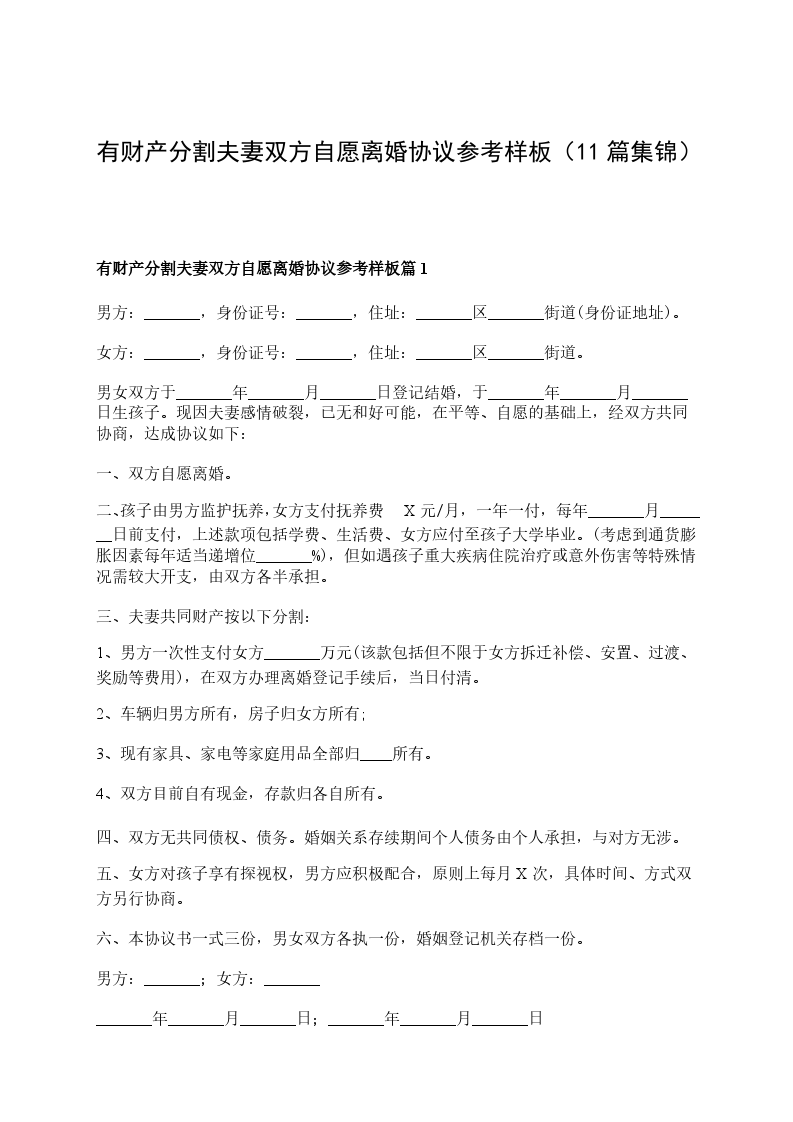 有财产分割夫妻双方自愿离婚协议样本篇11