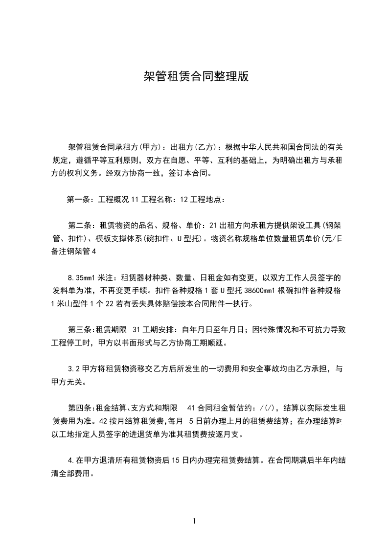 架管租赁合同承租方(甲方):出租方(乙方):根据中华人民共和国合同法的有关规定,遵循平等互利原则,双方在自愿、平等、互利的基础上,为明确出租方与承租方的权利义务。经双方协商一致,签订本合同。