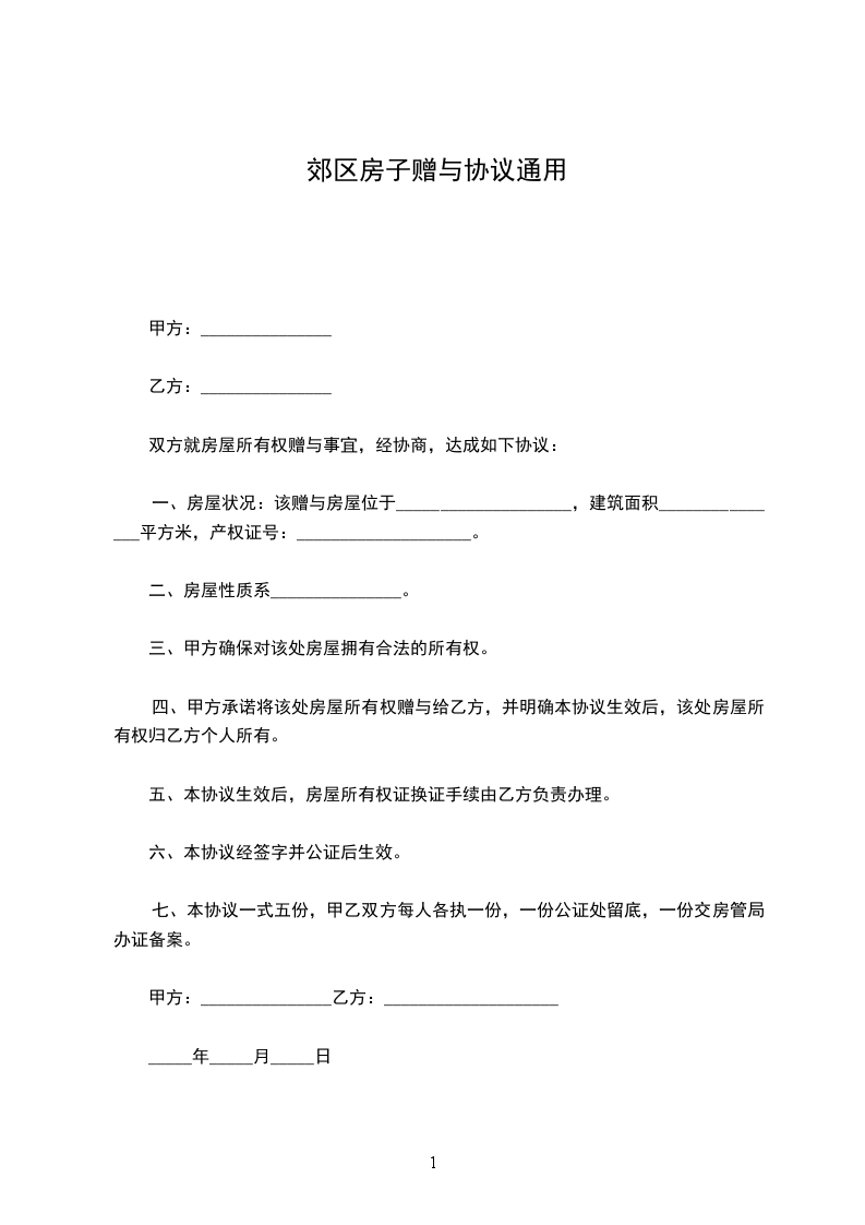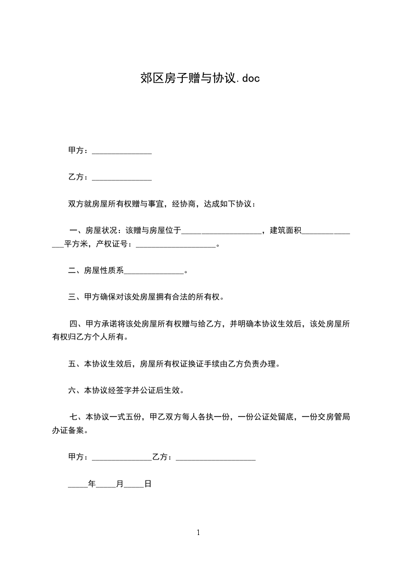 甲方决定将位于___________________________________的房屋一套,建筑面积_________平方米无偿赠与给乙方;乙方同意接受此赠与。