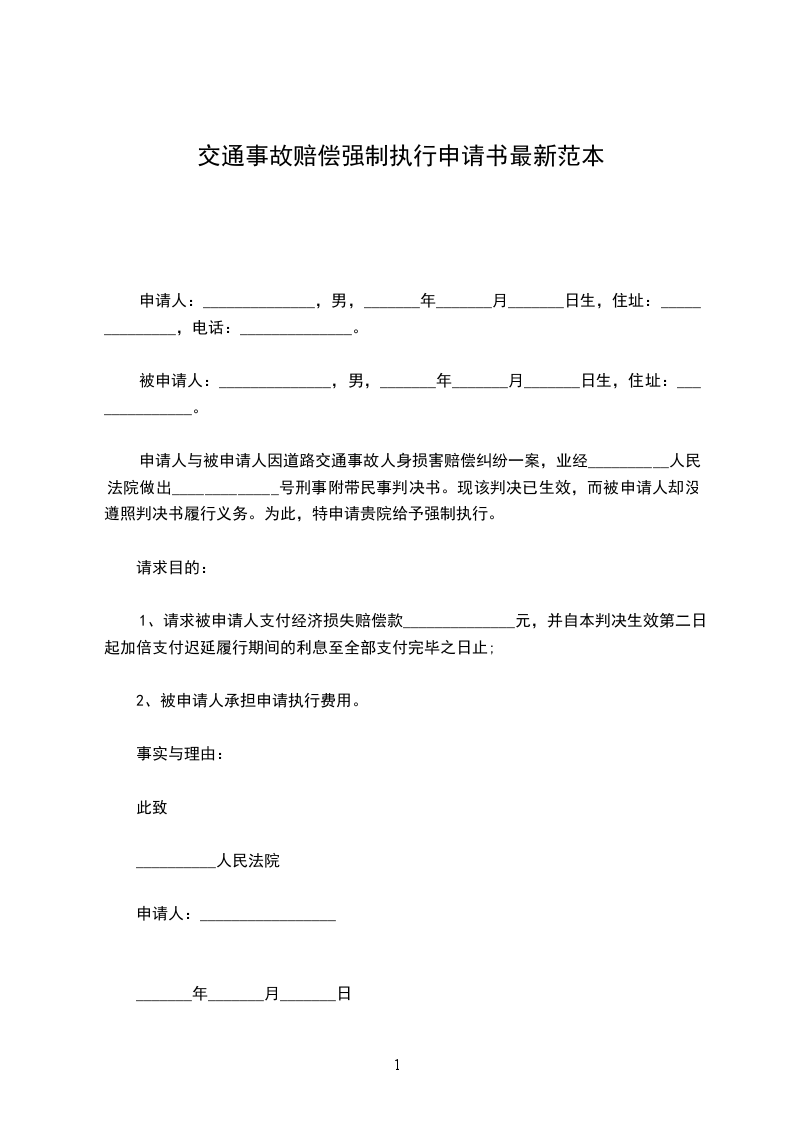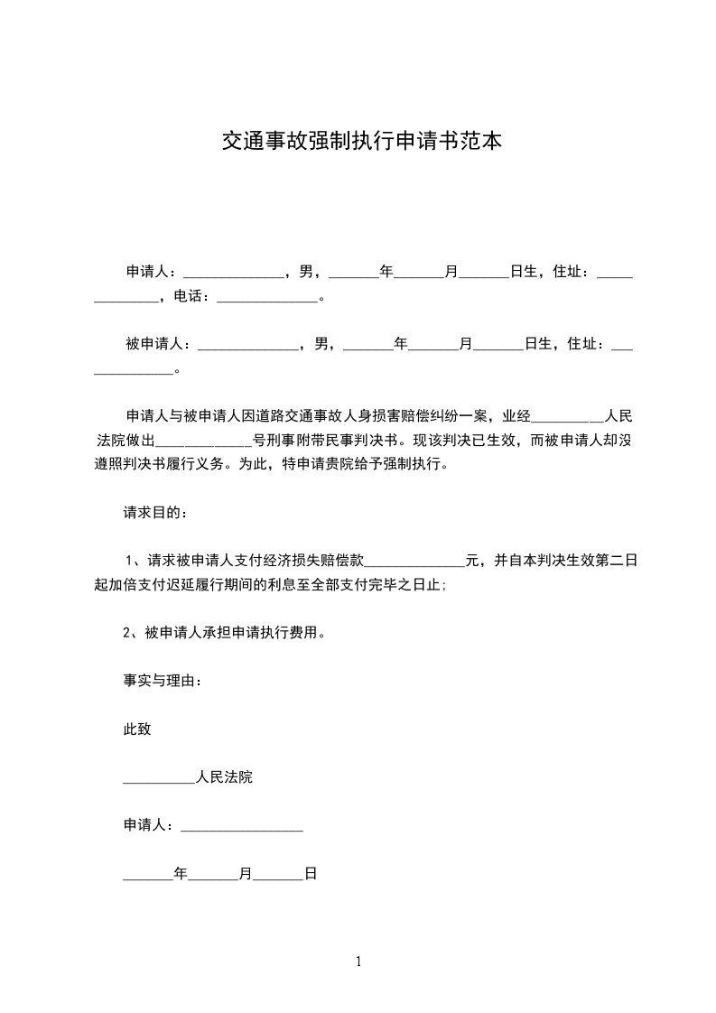申请请求:1,强制执行被申请人交通事故赔偿款_____________元及其利息_______________元(自_____年_____月_____日至_____年_____月_____日止按银行同期贷款利率计算的利息)及加倍支付迟延履行期间的债务利息。