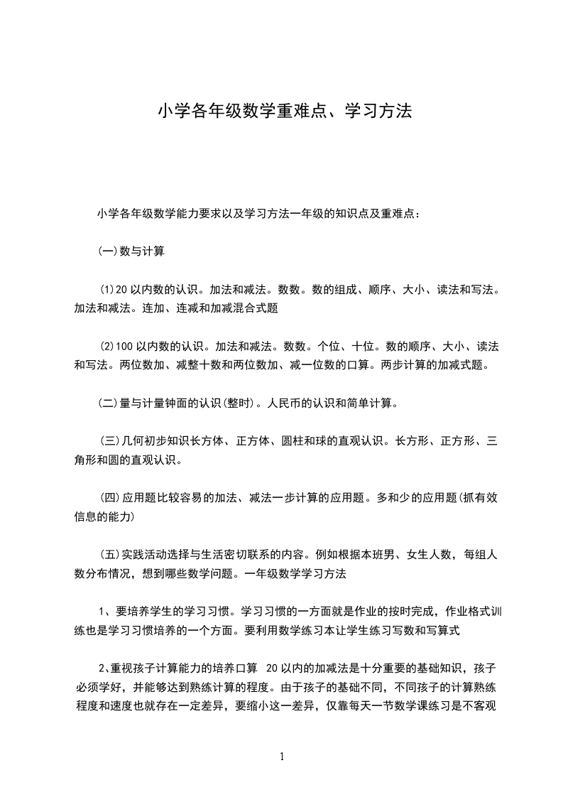 小学各年级数学能力要求以及学习方法一年级的知识点及重难点: