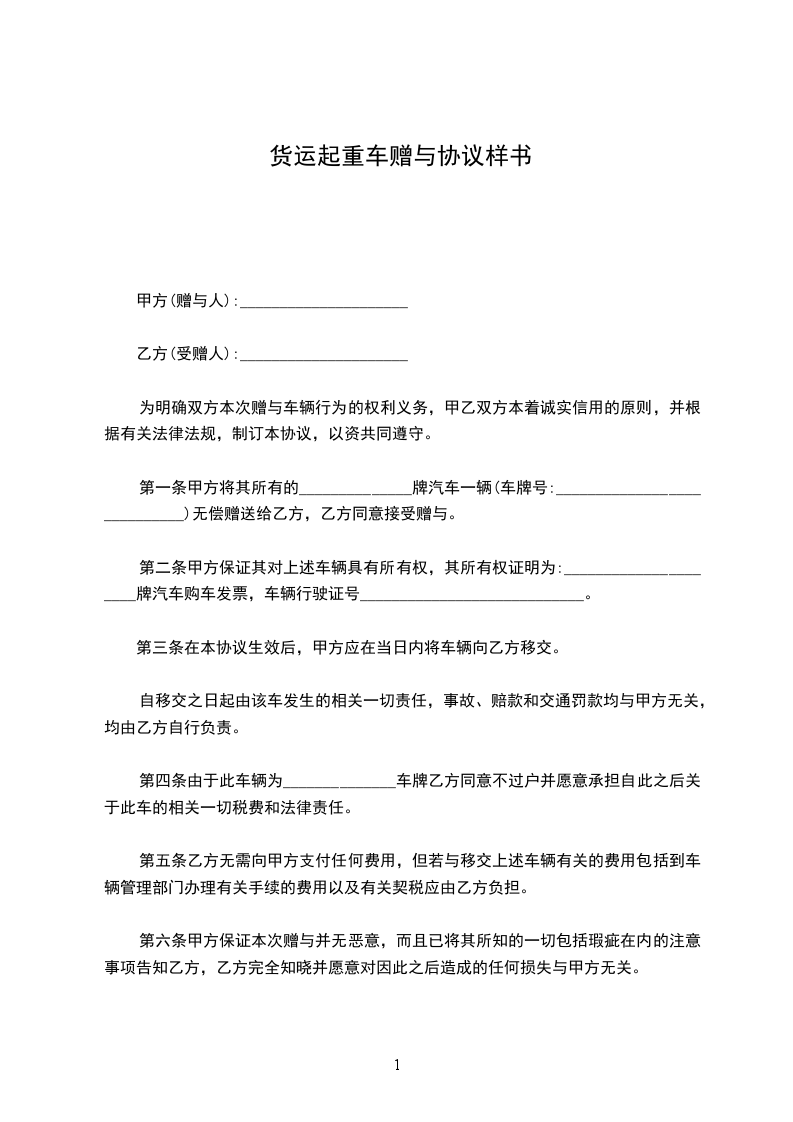 第一条甲方将其所有的______________牌汽车一辆(车牌号:____________________________)无偿赠送给乙方,乙方同意接受赠与。