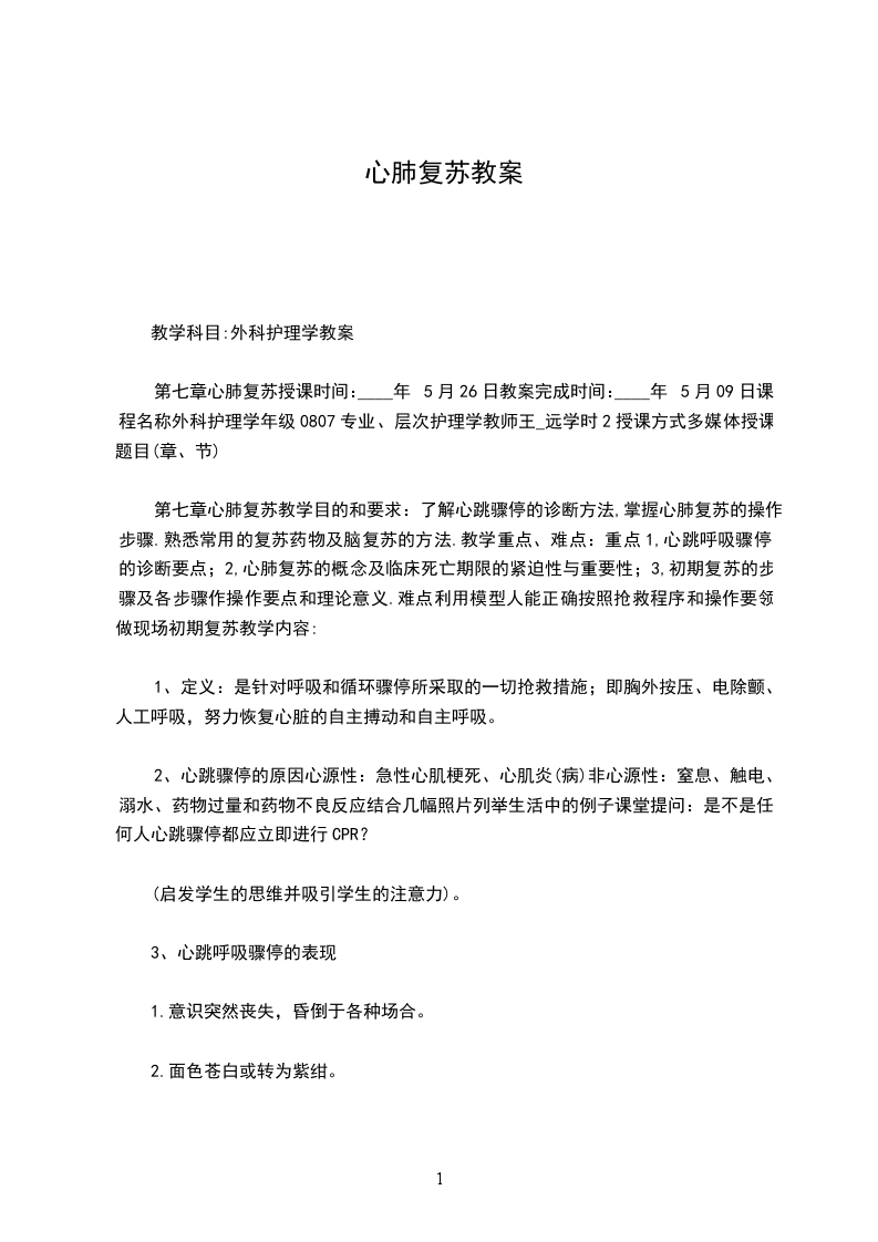 第七章心肺复苏授课时间:____年5月26日教案完成时间:____年5月09日课程名称外科护理学年级0807专业、层次护理学教师王_远学时2授课方式多媒体授课题目(章、节)