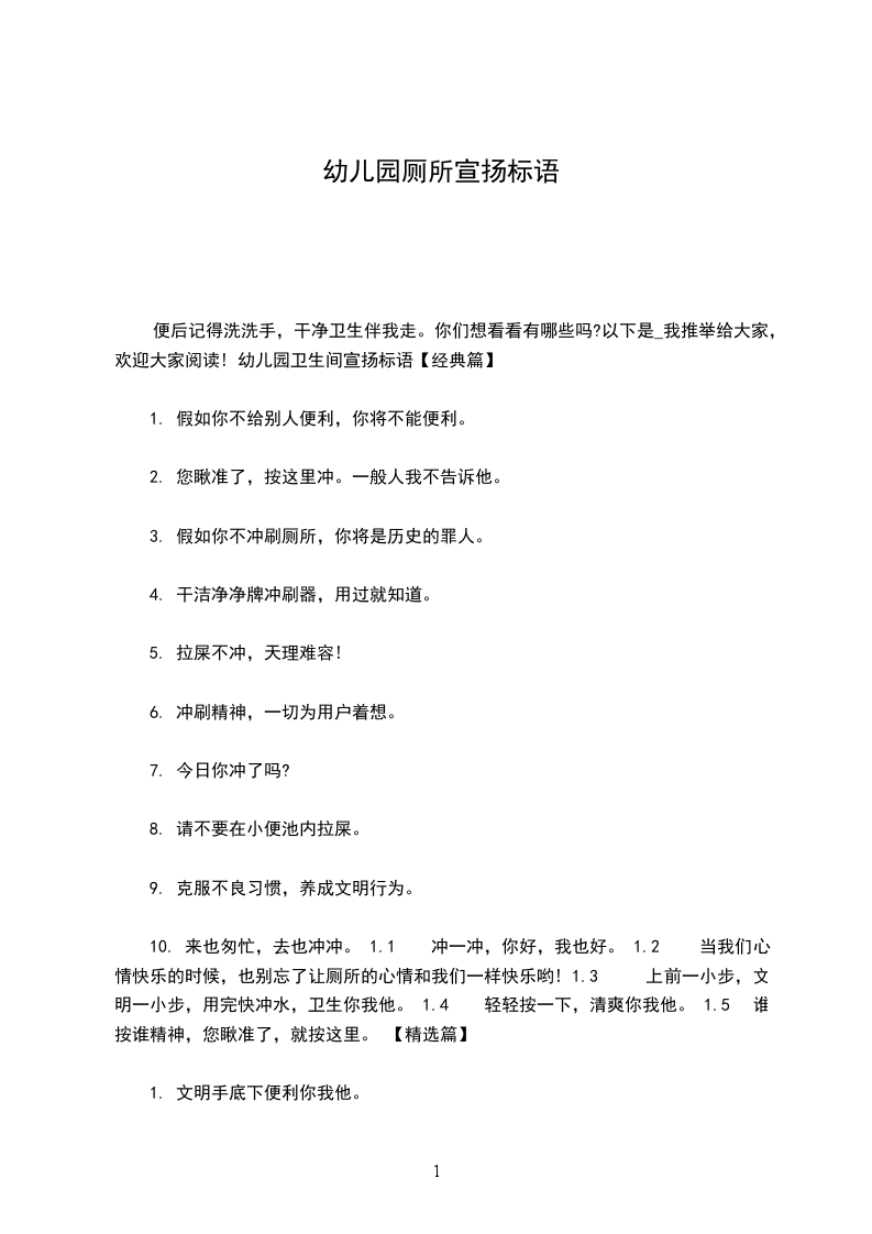 10. 爱惜公共设施,是你我应尽的责任。 1.1 大环境,小环境,洁净才有好心情。 1.2 贴近文明,靠近便利。 1.3 如厕冲水了无痕,道德水准功告成。 1.4 今日,你冲了吗? 1.5 起身冲一冲,大家都轻松。 厕所宣扬标语【集锦篇】