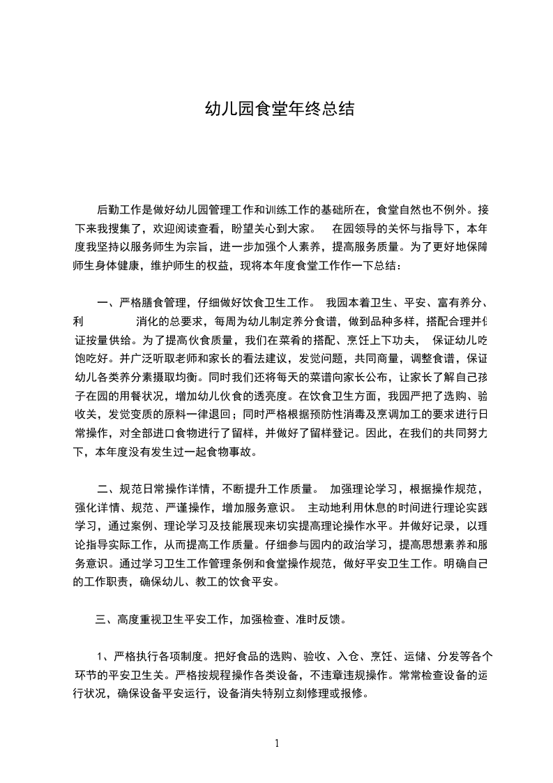 6、加强食堂仓库的管理,进出货准时登记,保证幼儿摄盐量、摄油量等不超标。 幼儿园食堂的平安卫生管理工作挺直关系到孩子们的健康与幼儿园的稳定进展。在今后的工作中,我们会不断探究实践,不断总结反思,将食品卫生工作纳入日常重点工作范畴,更杰出地完善各项工作! 篇二: 本年度在园领导的多方指导关怀关心,全体教职工的理解和支持下,厨房在本年度较好的完成了各项工作,现将具体的工作总结如下: