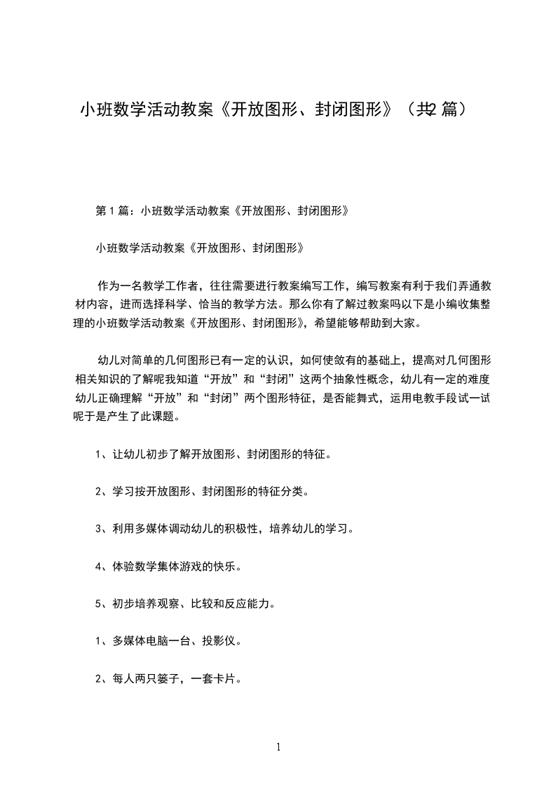 第1篇:小班数学活动教案《开放图形、封闭图形》